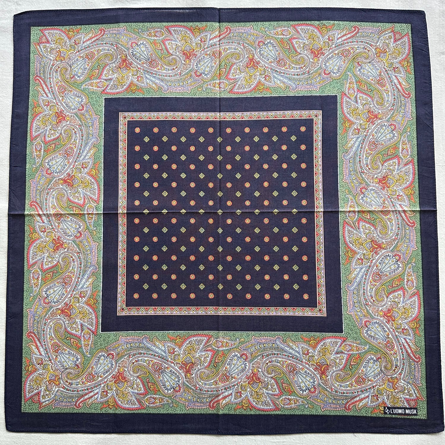 Vintage Handkerchief Blue Cotton Paisley Green Flourish Pattern Pocket Square 19