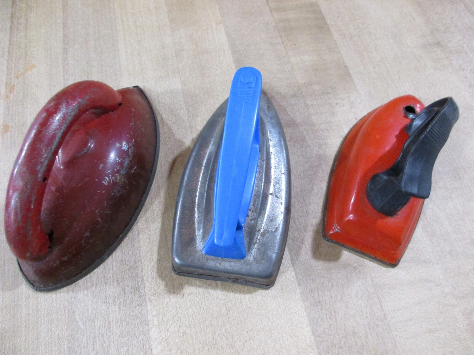 3 Vintage Childs Tin Metal Irons Kids toys r