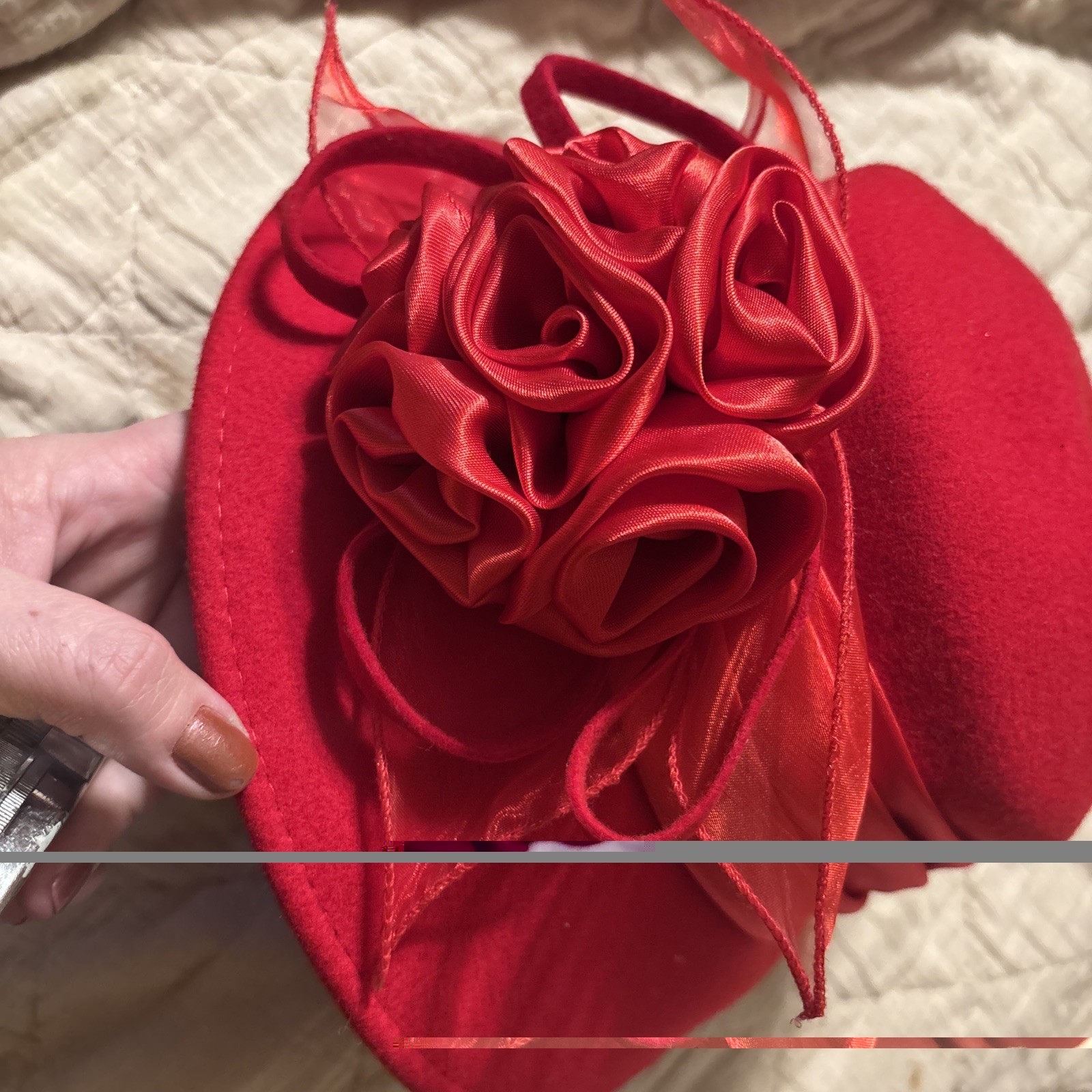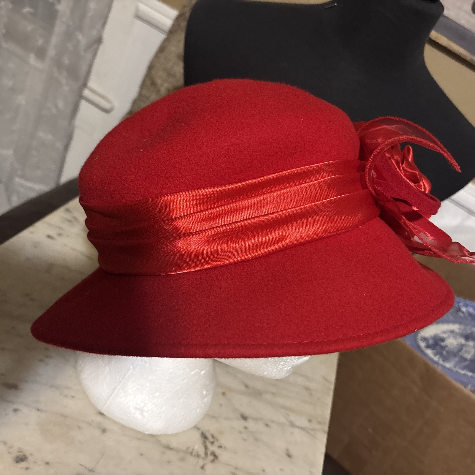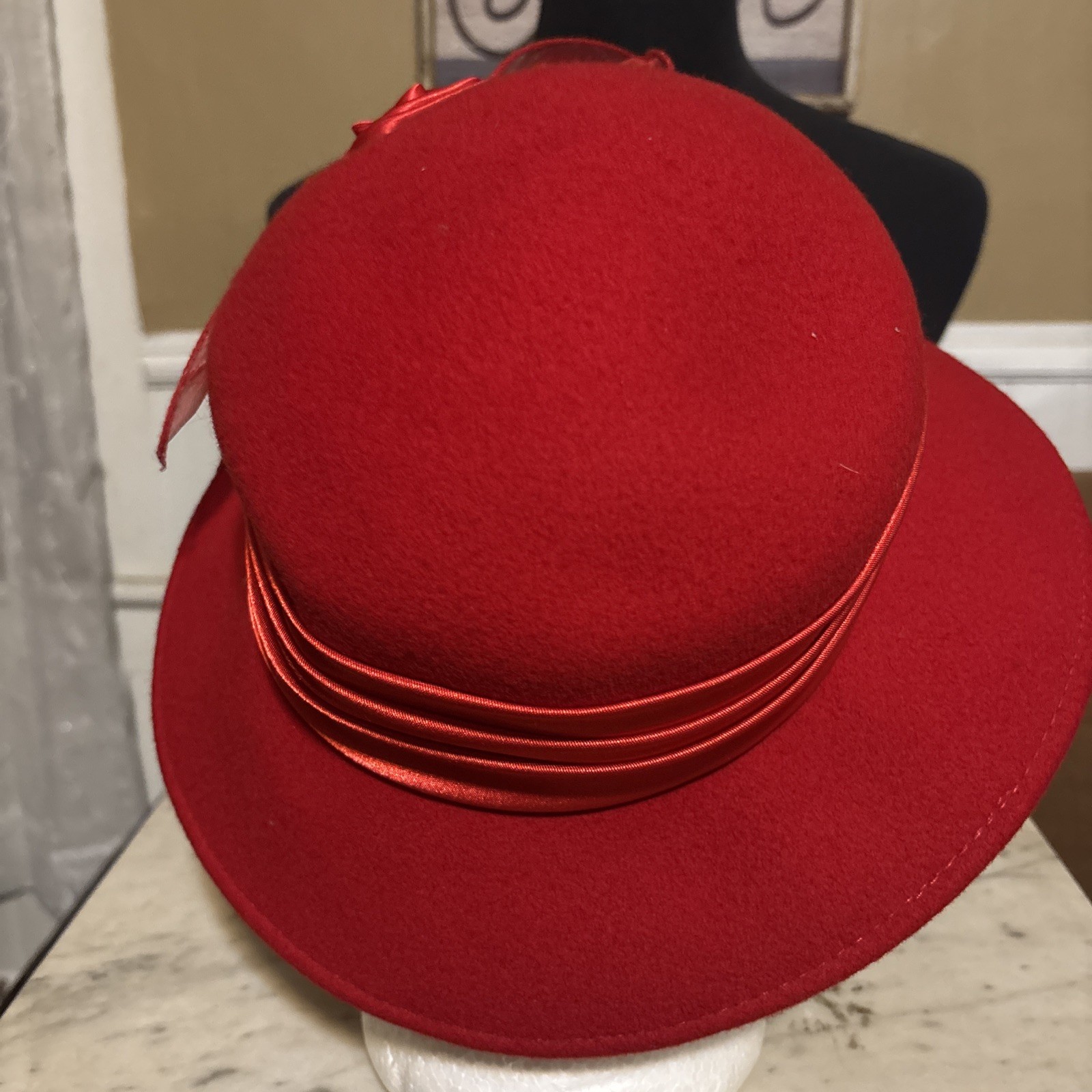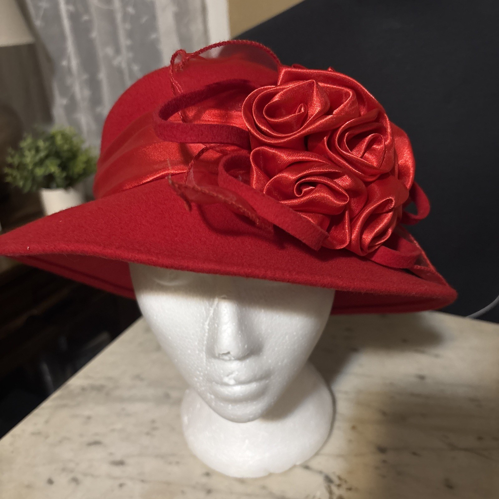 как выглядит Ladies Red Feather Flower Brim Wool Felt Dress Hat ELEGANT RED HAT SOCIETY Derby фото