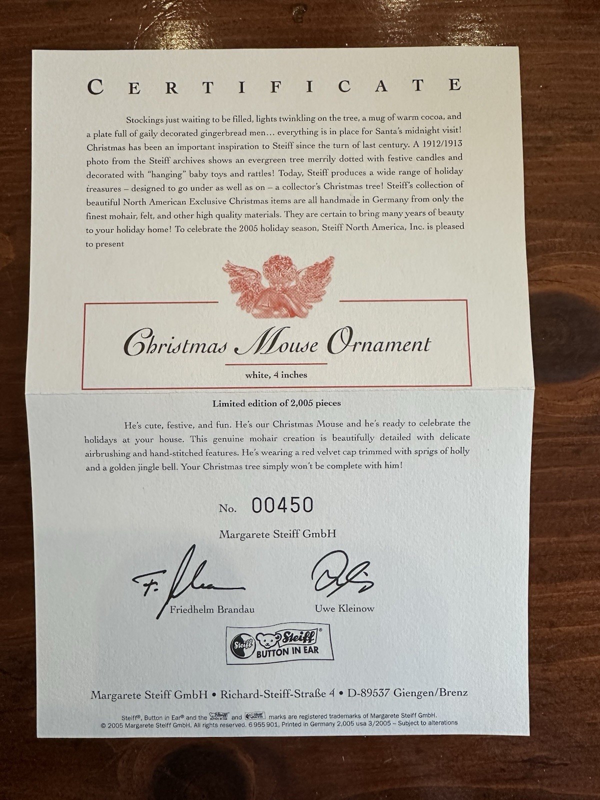 как выглядит Steiff Christmas Mouse Ornament Pieps 2005 Exclusive Lmd Edition фото