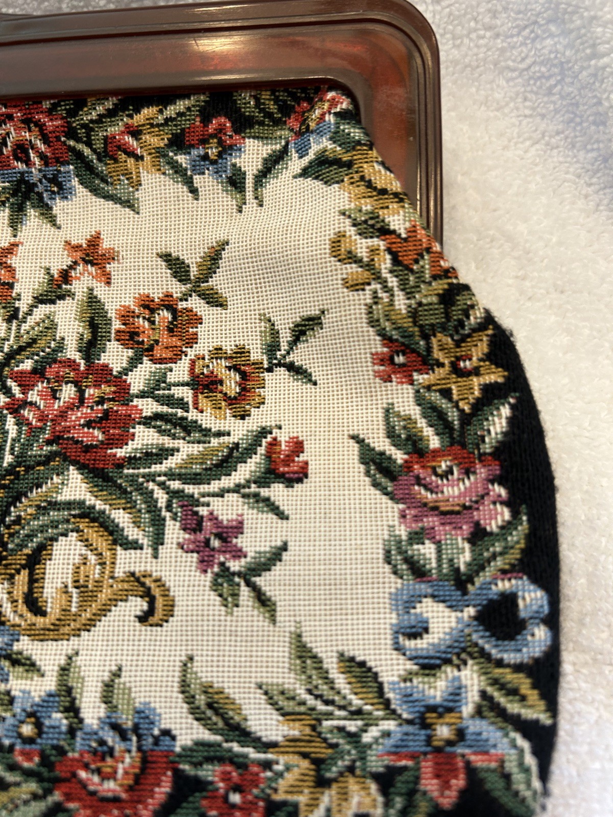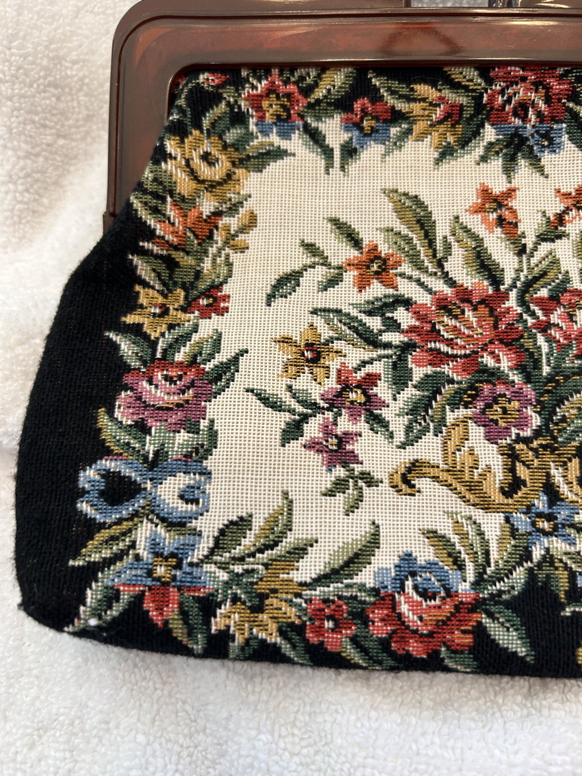 Vintage Tapestry Clutch Purse, lucite frame handle