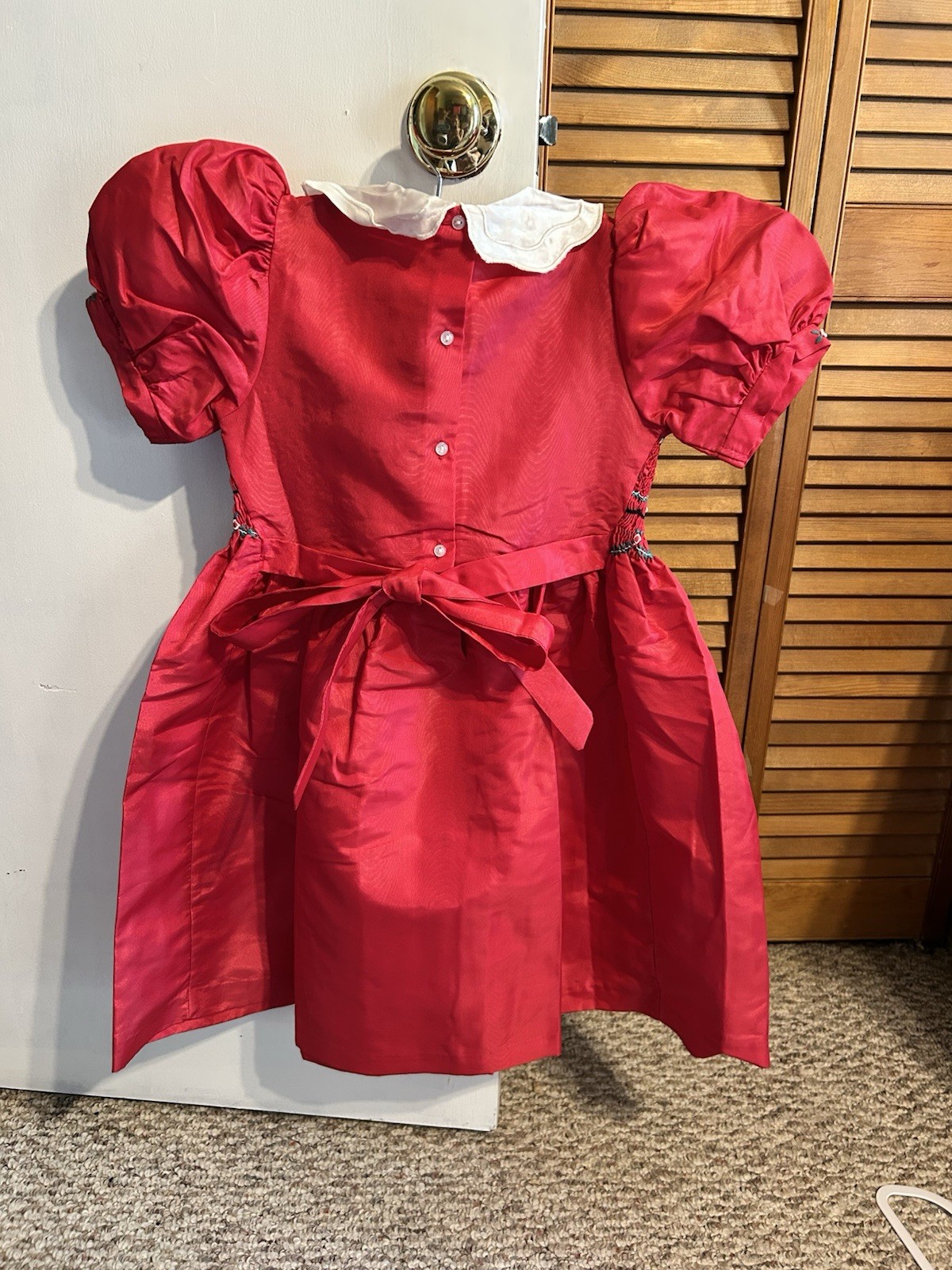 как выглядит Vintage Girls Smocked Red Holiday Dress Puff Sleeve Embroidered With Collar фото