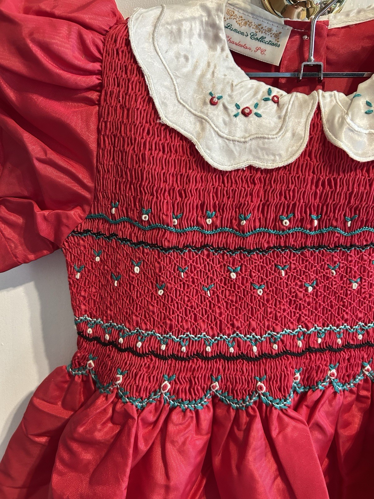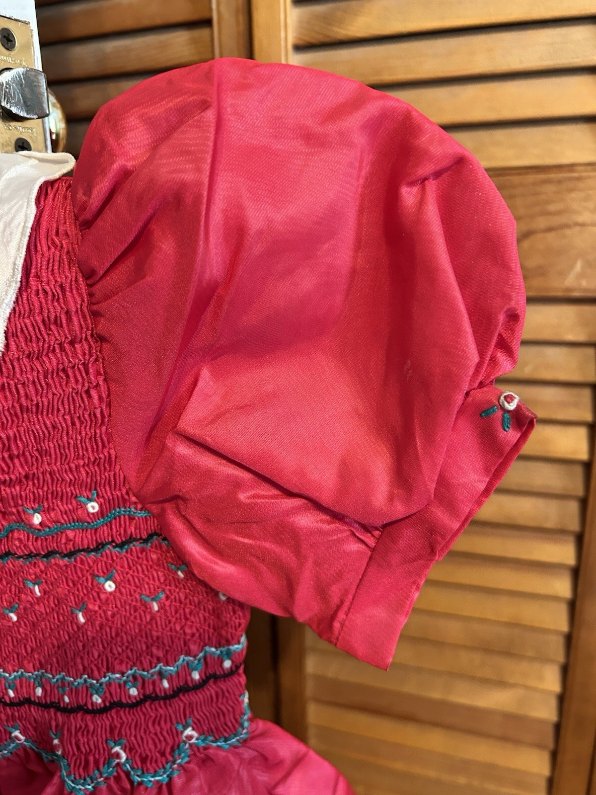 Vintage Girls Smocked Red Holiday Dress Puff Sleeve Embroidered With Collar