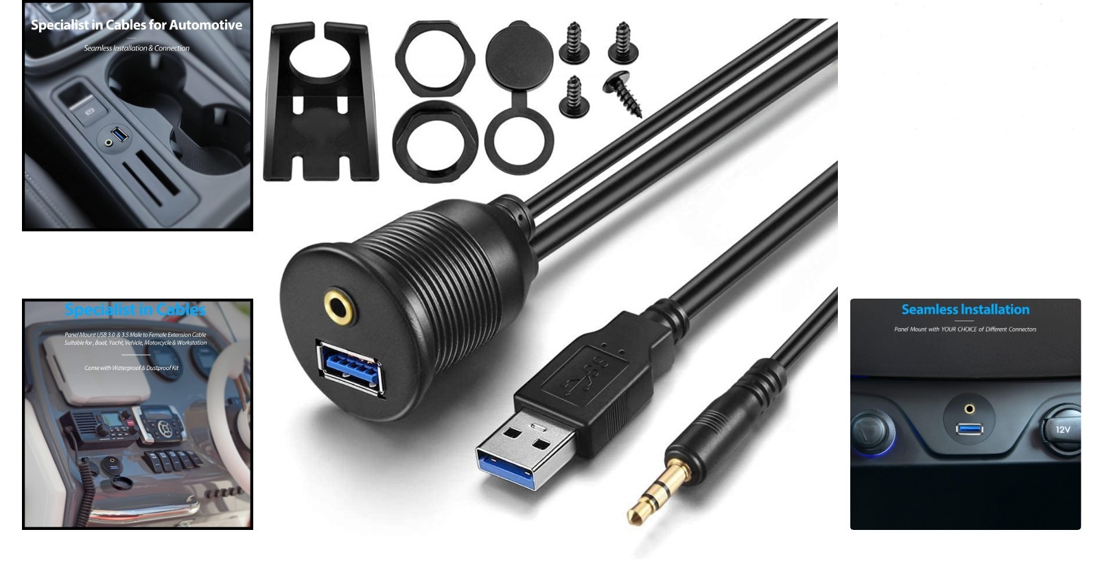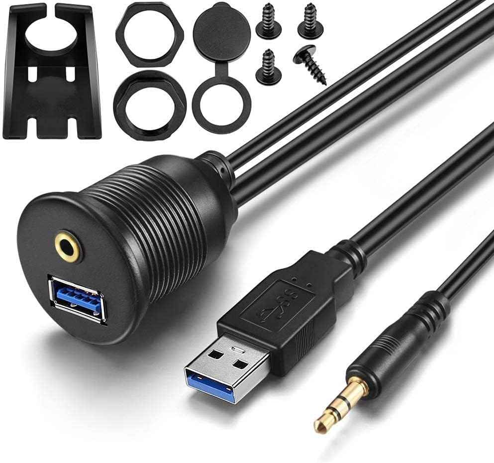 USB Extension Cable 3ft 3.5mm AUX Panel Mount for Car Boat Motorcycle