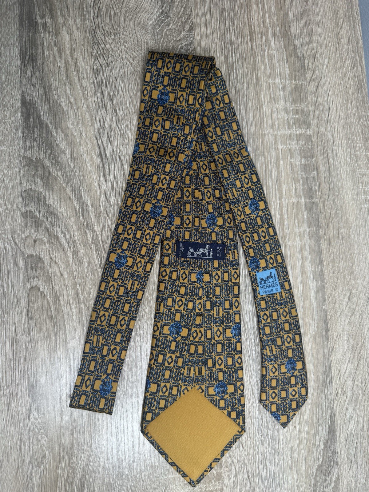 как выглядит Hermes Silk Yellow Tie With Blue Print, 3.75in фото