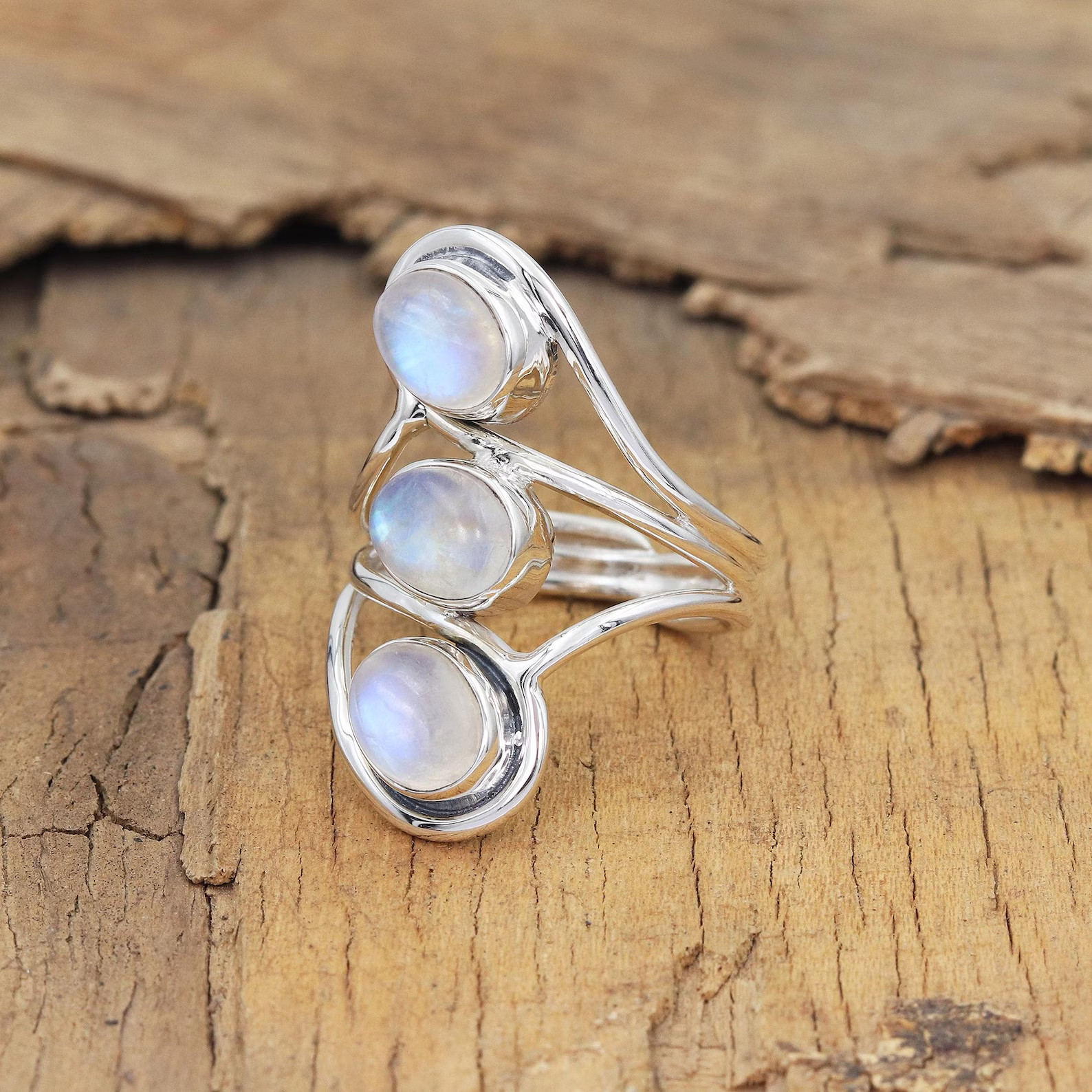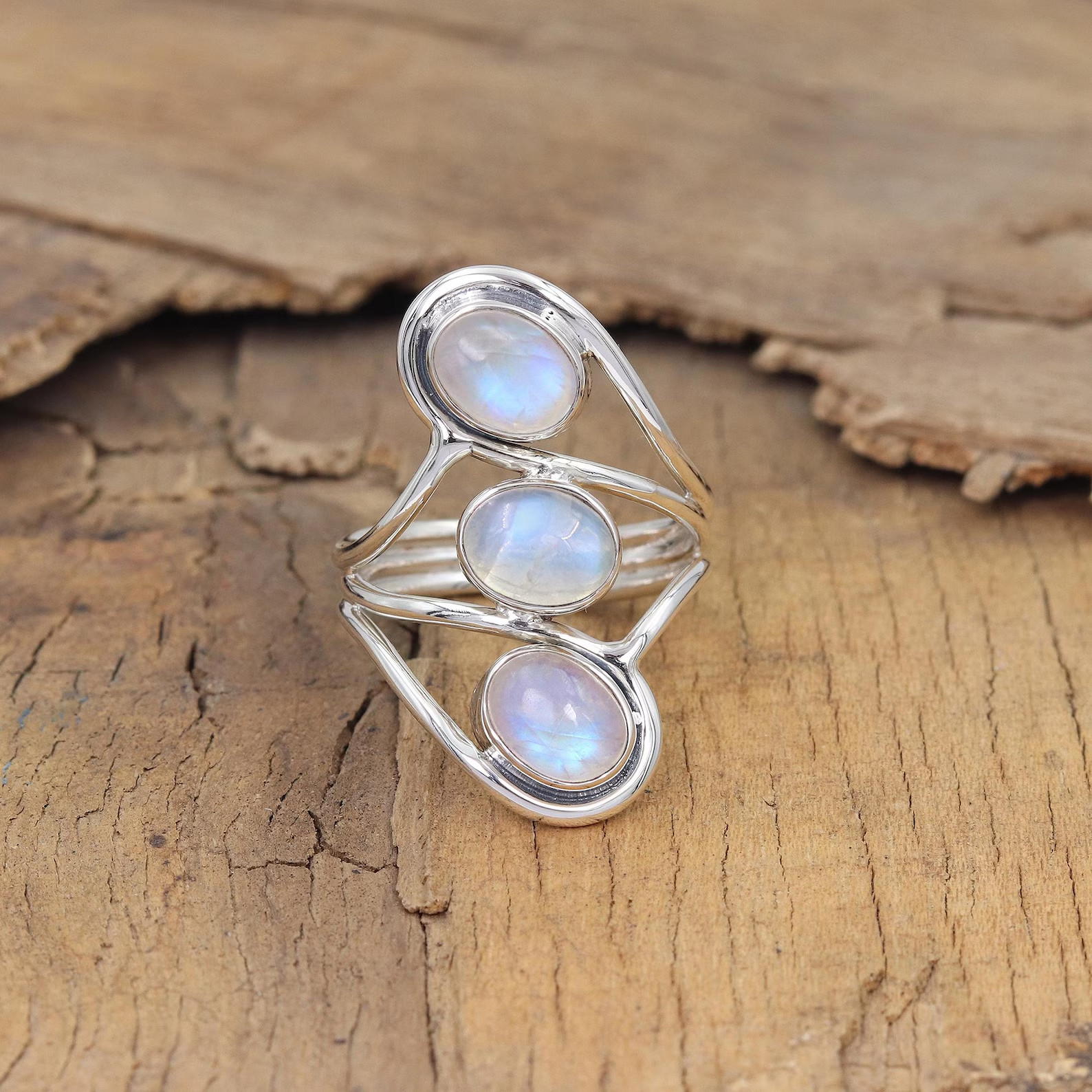 как выглядит Moonstone Ring, 925 Solid Sterling Silver Ring, Three Stone Ring, Gifts For Her фото