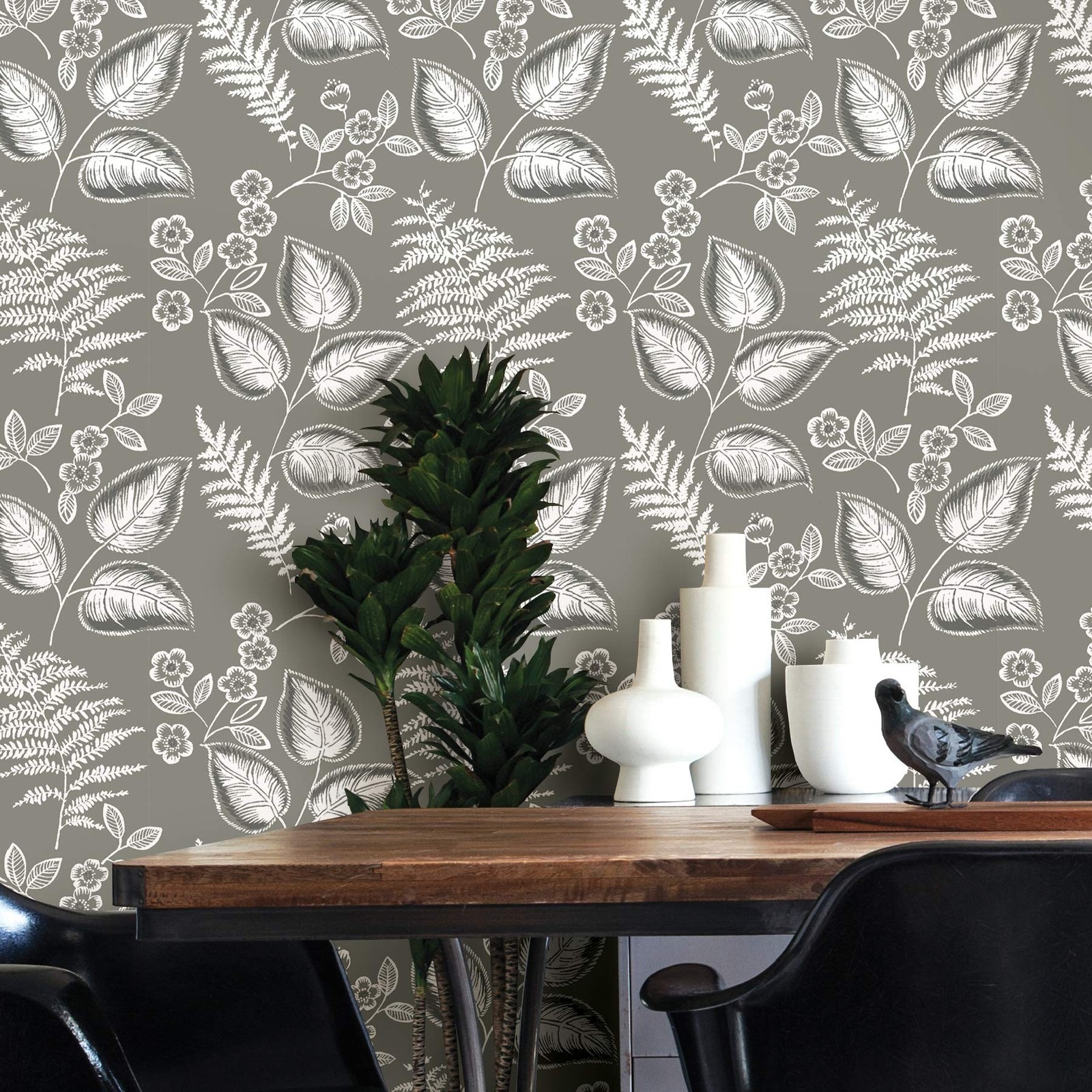 как выглядит NuWallpaper NUS3143 Foliage Peel Stick Wallpaper, Grey фото