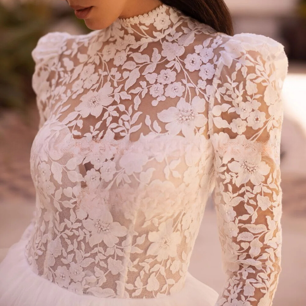 High Neck Tulle Wedding Dresses Long Sleeve Buttons Back Appliques Bridal Gowns