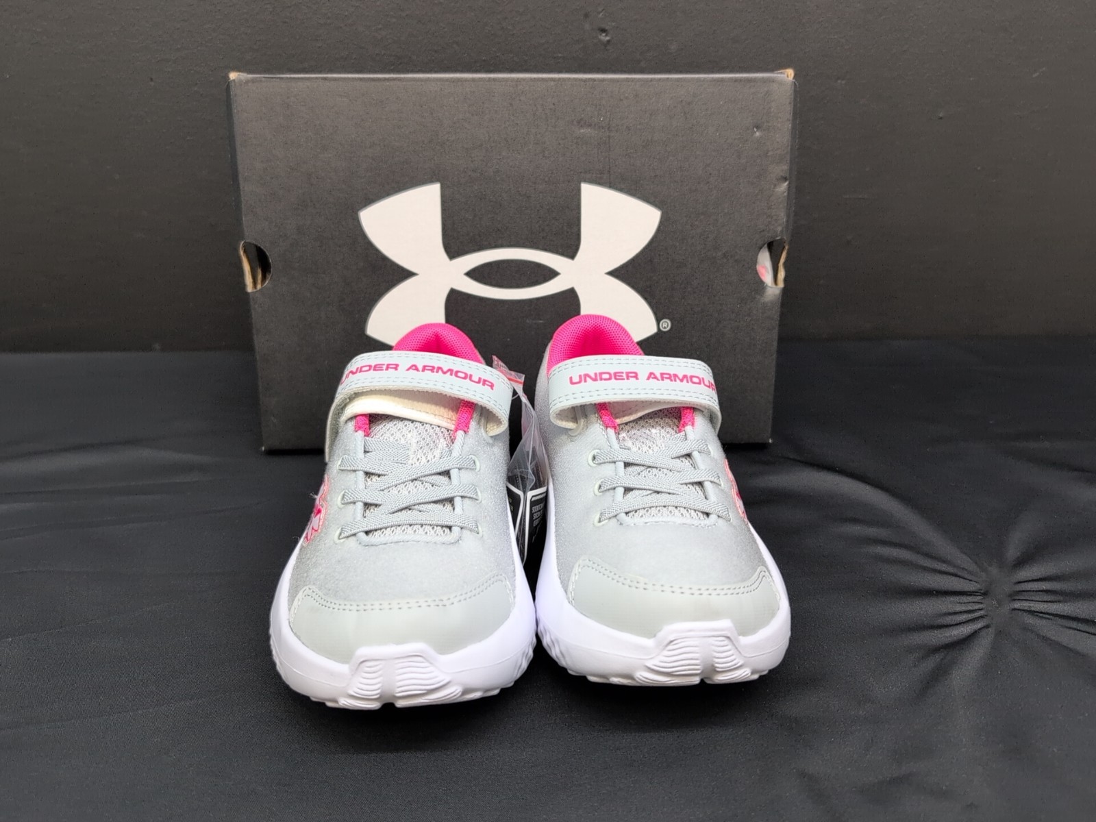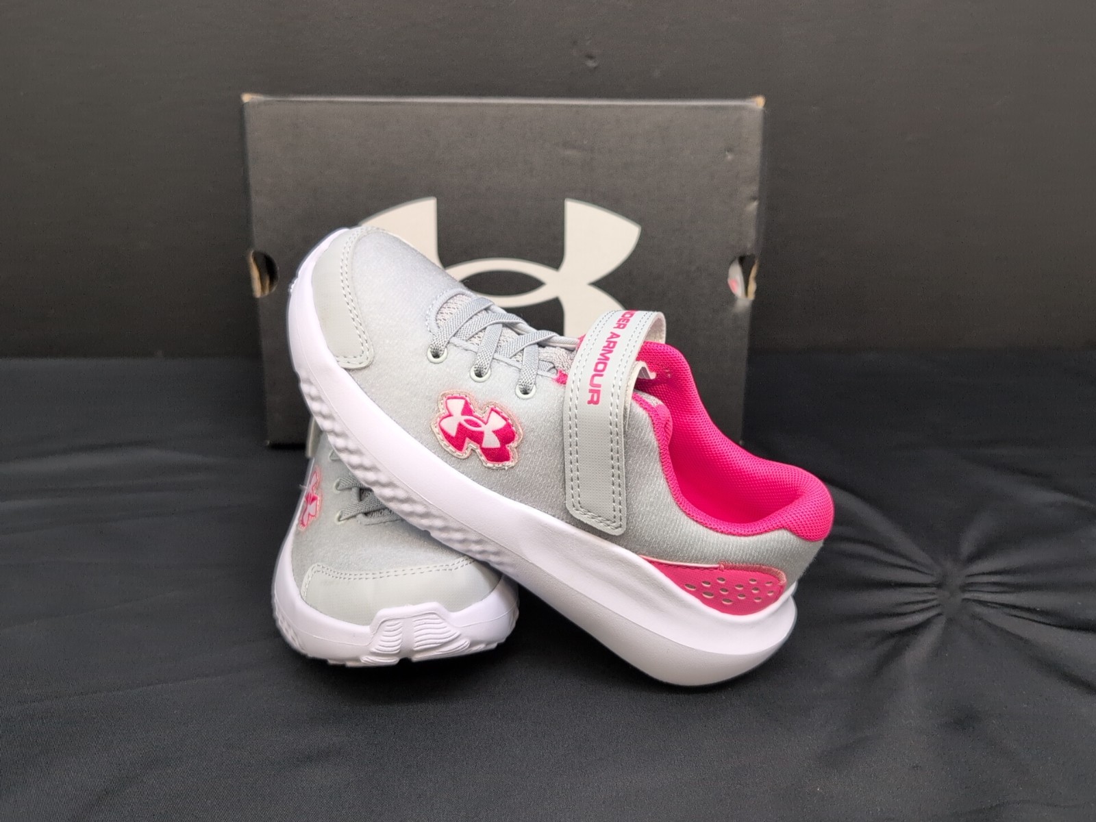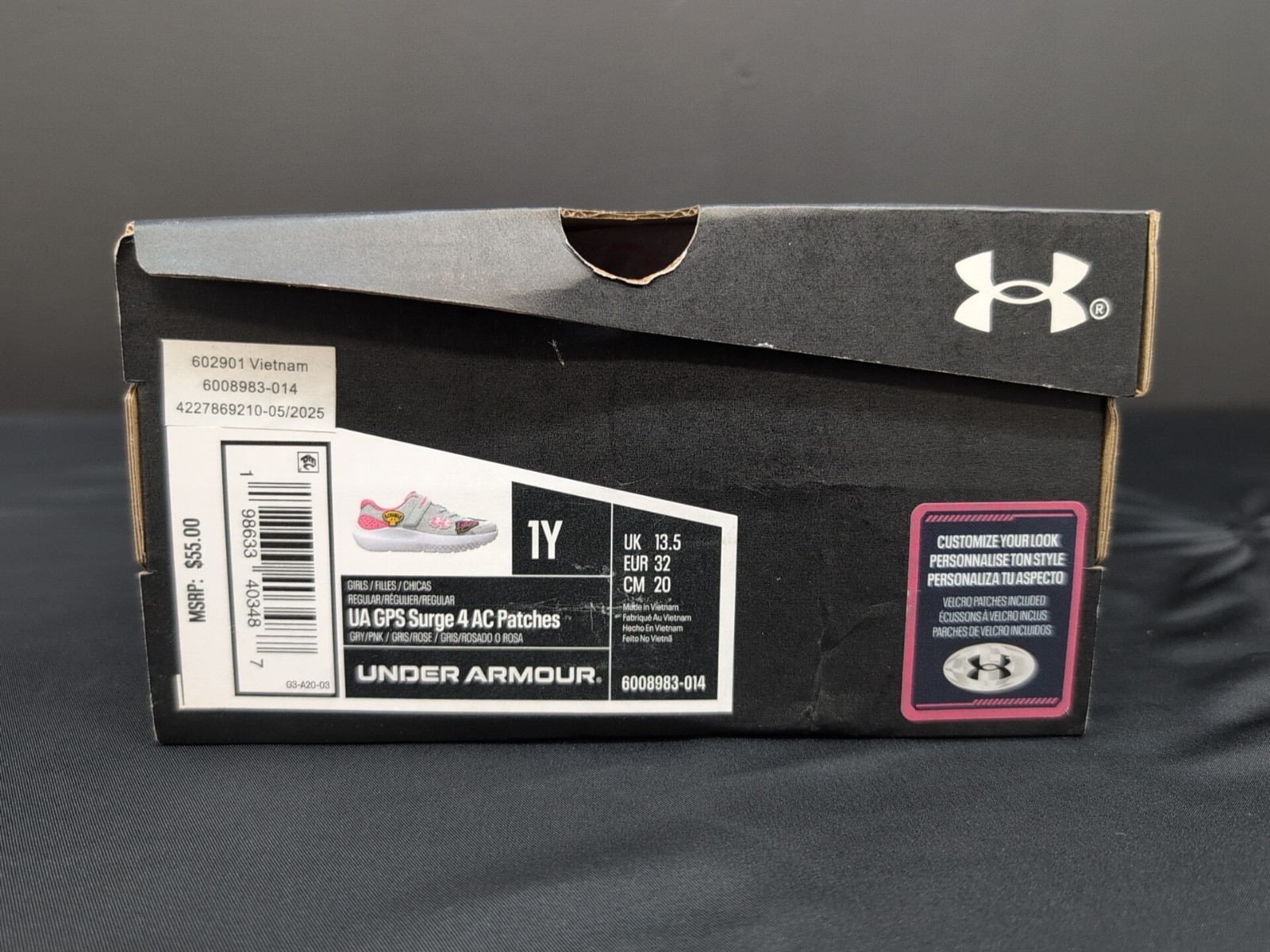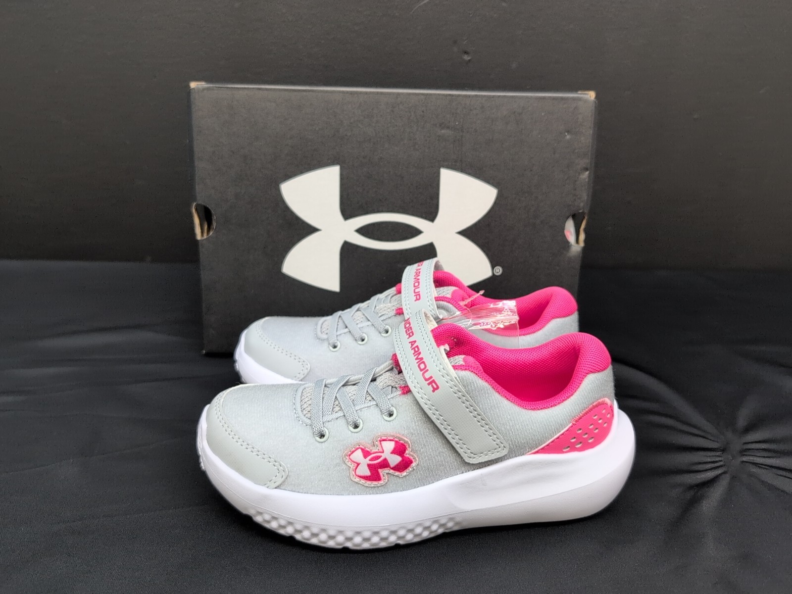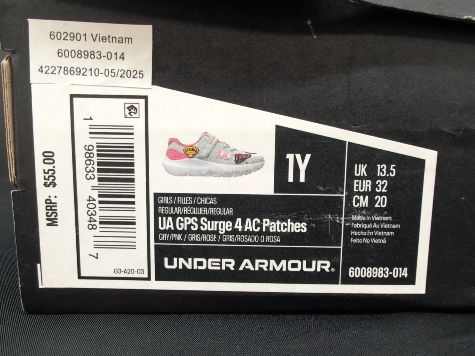 Under Armour GPS Surge 4AC Patches Girls Running Shoes US 1Y Gray Pink White