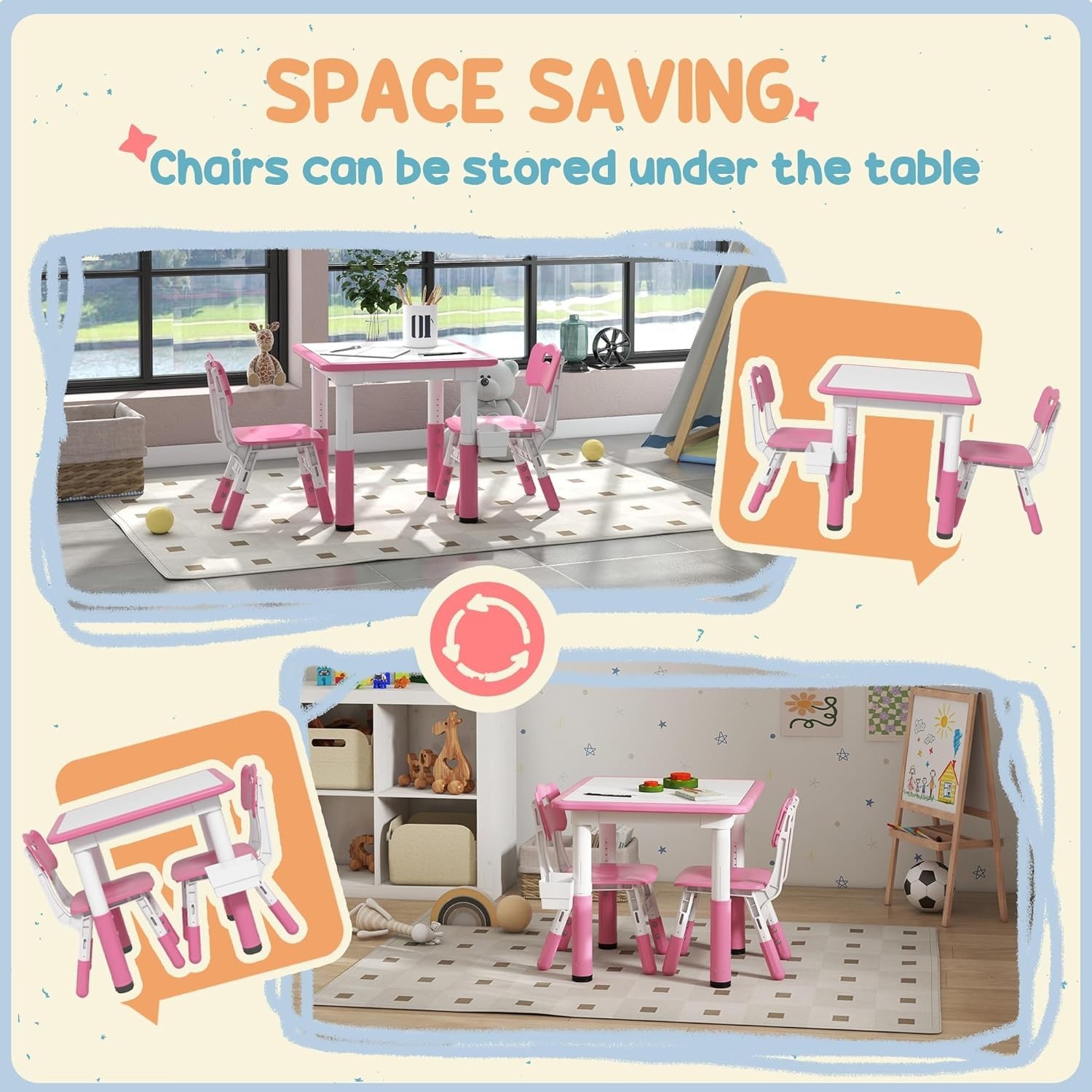 3 Piece Kids Table and Chairs, Height Adjustable Toddler Table and Chair Set wi
