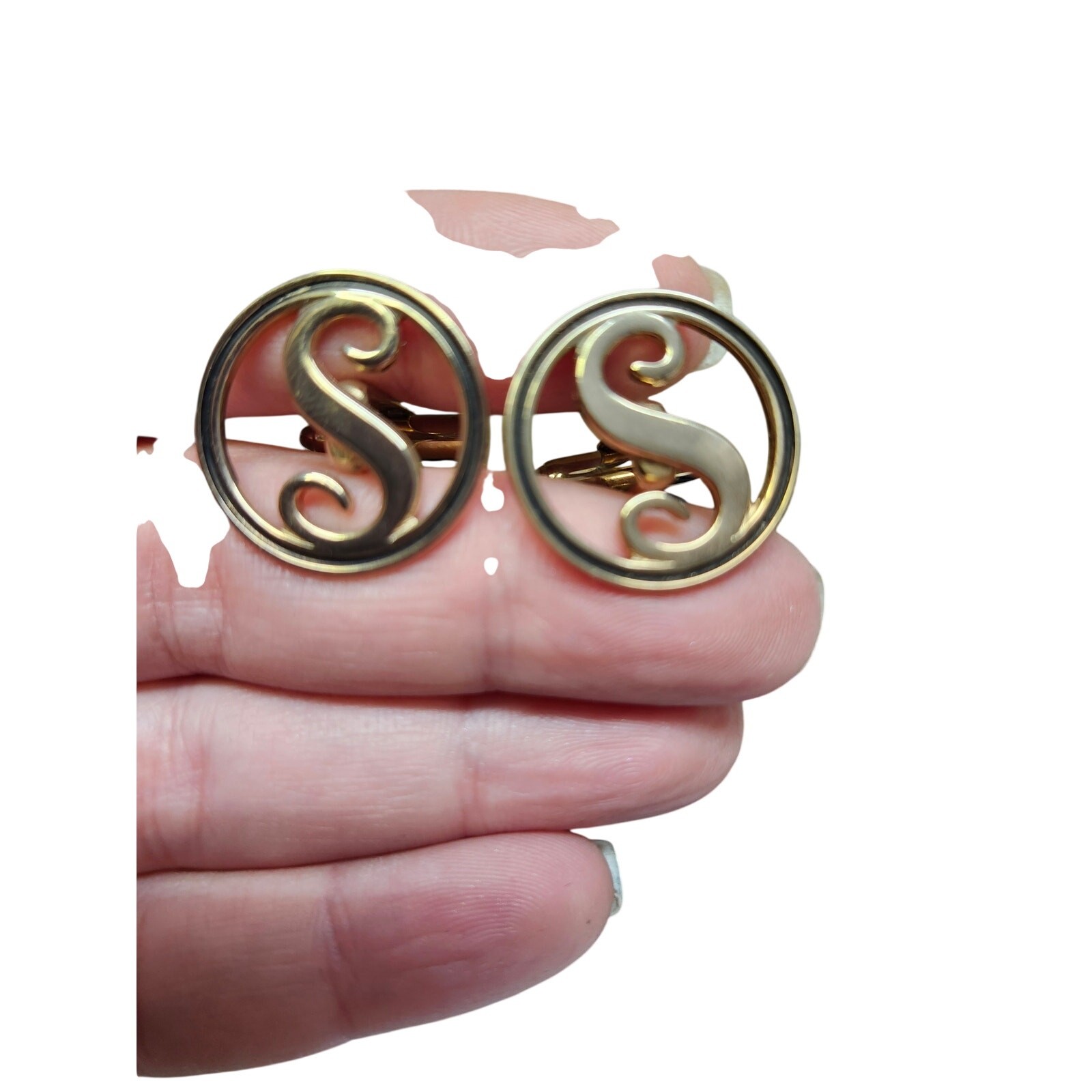 Vintage gold tone black enamel with letter S round cufflinks with box