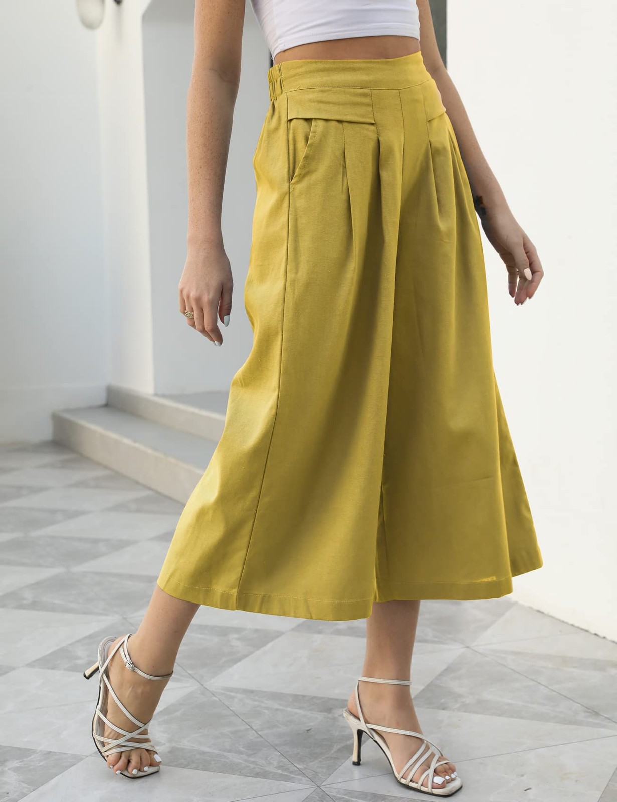 Womens Culottes Linen Blend Wide Leg Pants Elastic Waist Palazzo Trousers