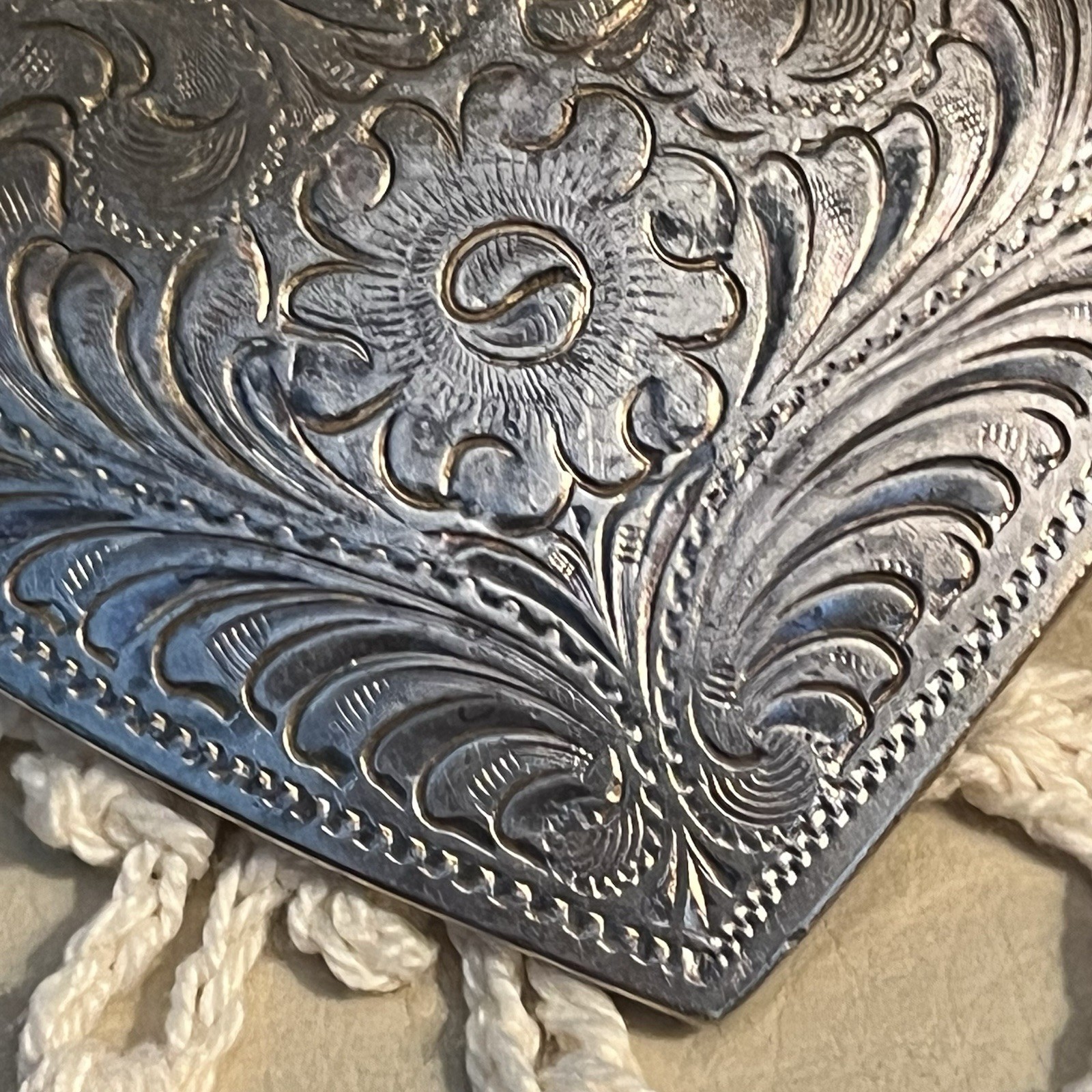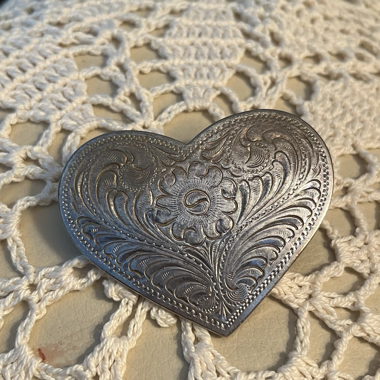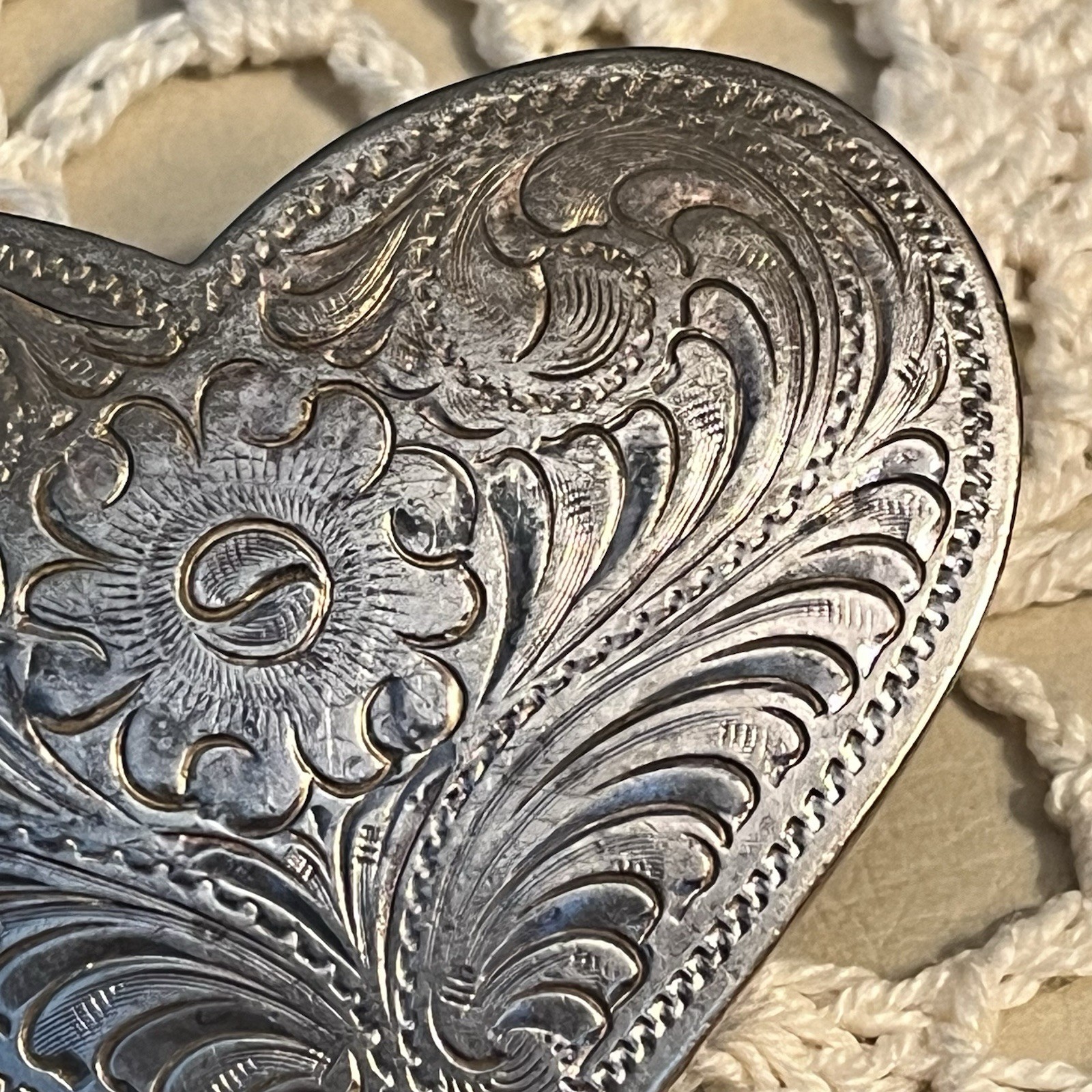 VTG Western Silver Plate Engraved Heart Belt Buckle Floral Scroll 2.5