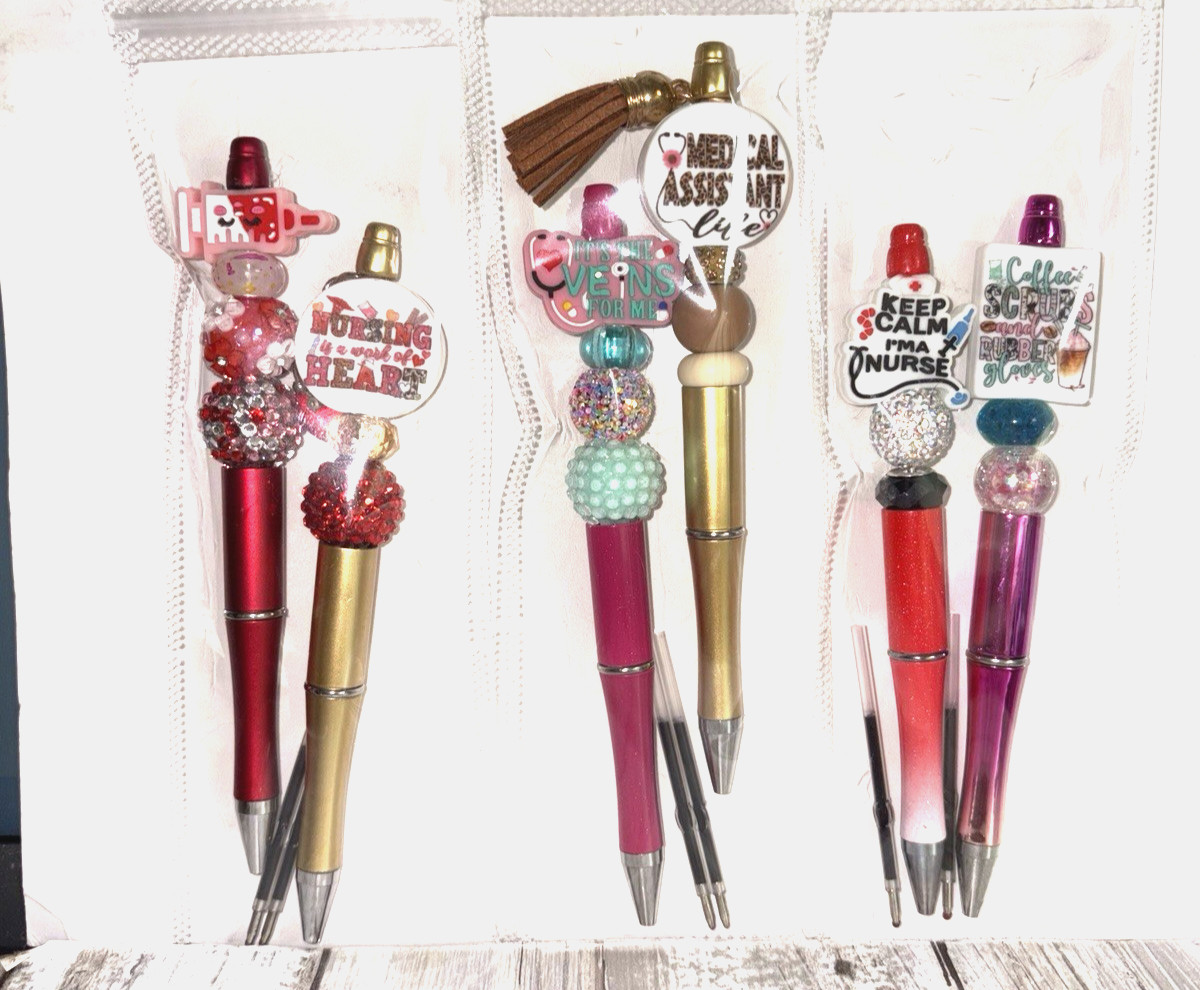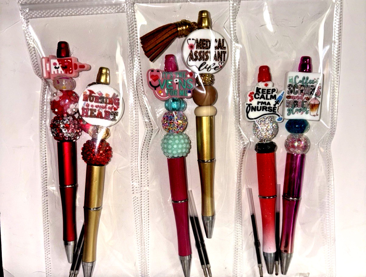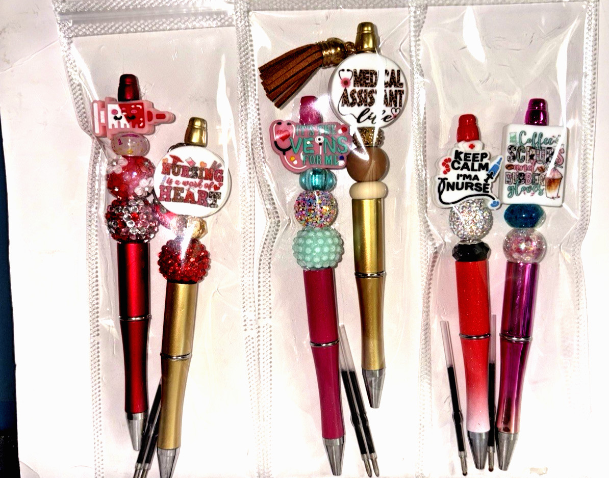 6 miscellaneous beaded pens with 1 ink refill each- nurse theme