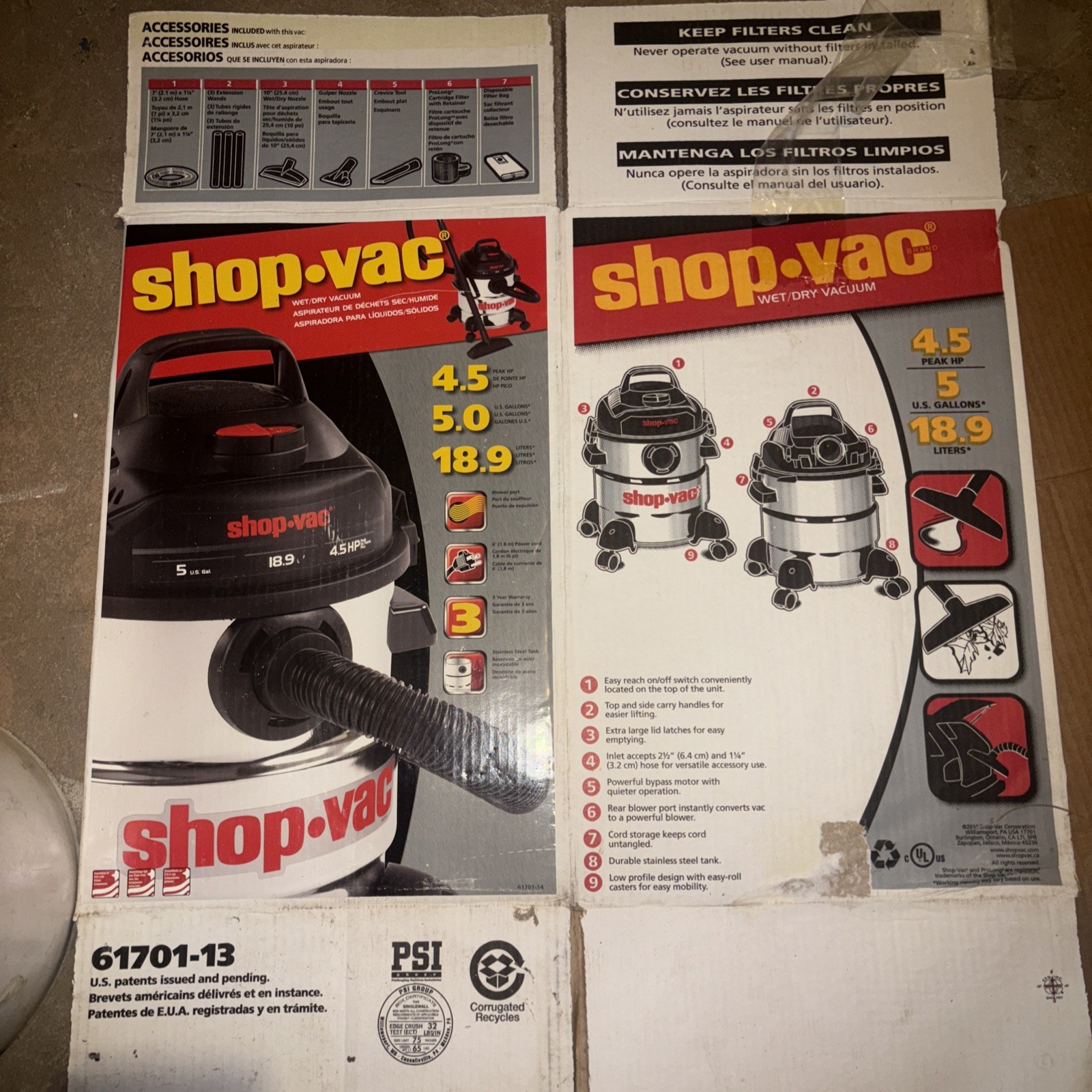 Shop Vac Wet Dry Vacuum 5 Gallon 4.5 Peak Hp Stainless Steel NEW