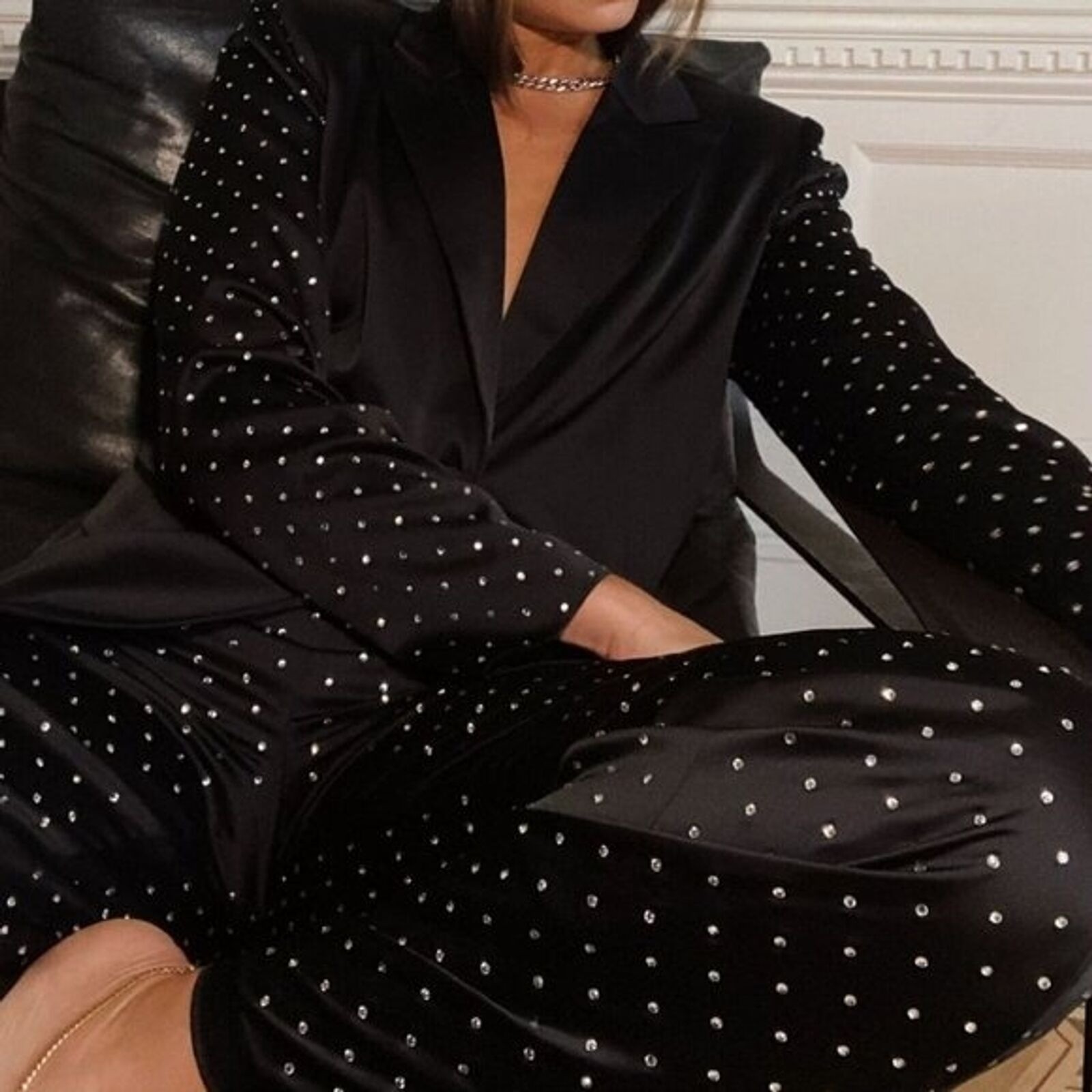 как выглядит NWT Danielle Bernstein Black Satin Studded Wide Leg Pants  US 4  Evening Chic фото
