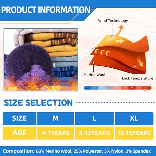 Kids Merino Wool Ski Socks Boys Girls Thermal 13-15 Years Purple/Blue/Brown