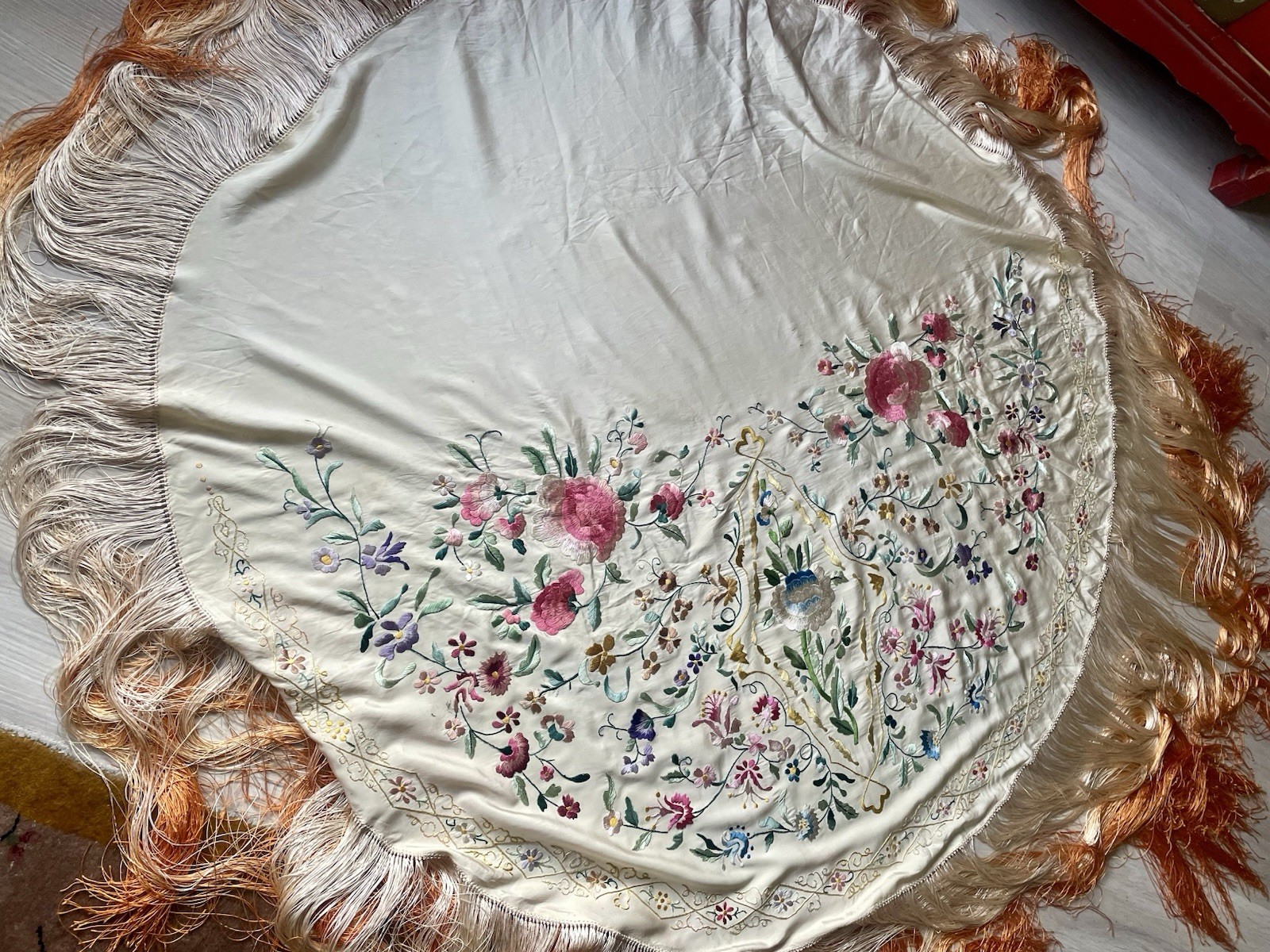 Antique 1920's Chinese Embroidered Silk Piano Shawl w/Orange Ombre 21 Fringe