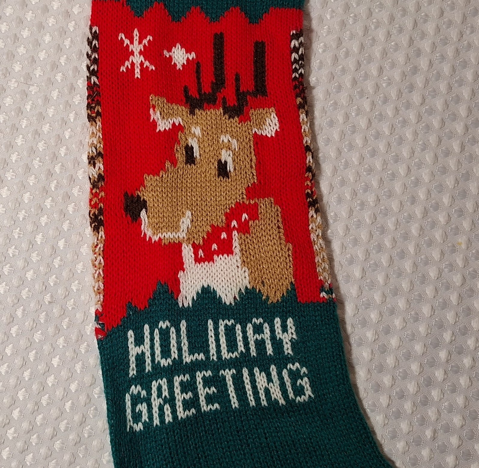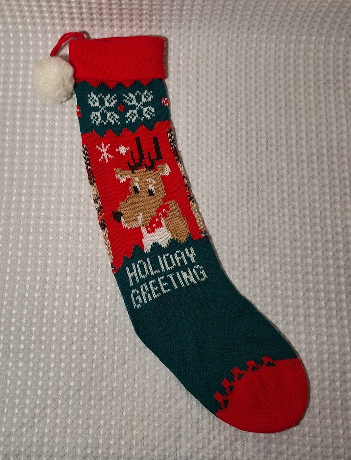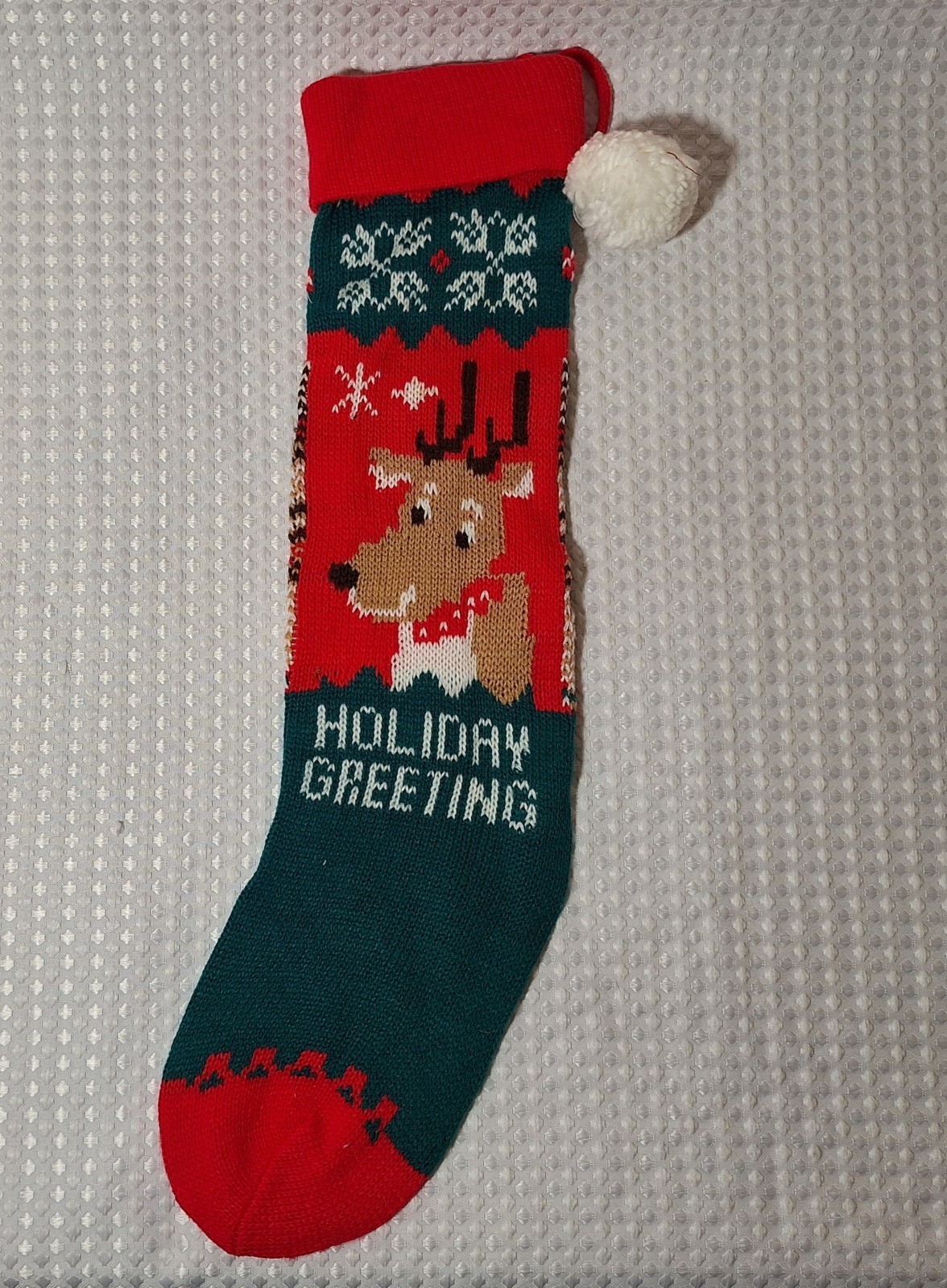 • Vintage Christmas Knit Stocking Reindeer 20 Long Holiday Greeting Red Green