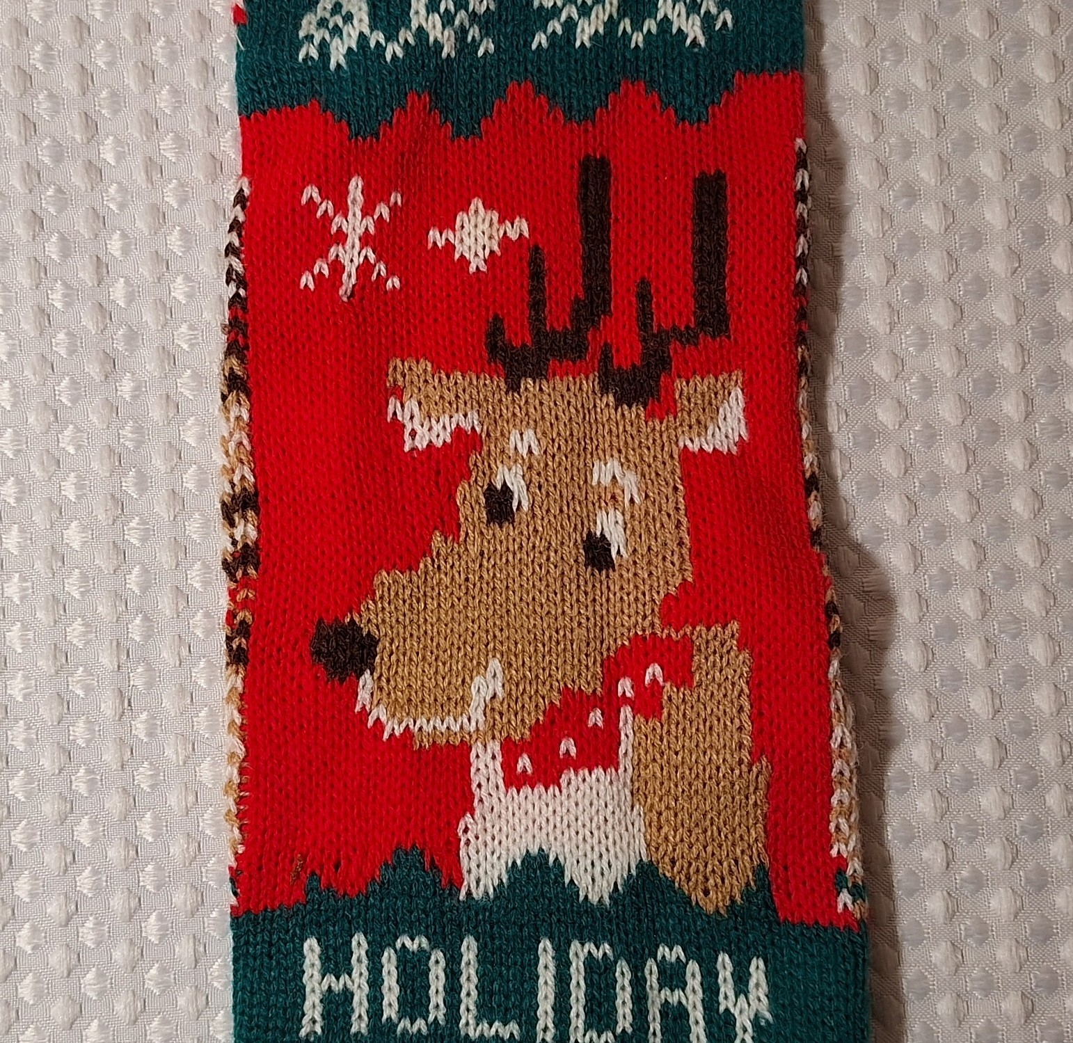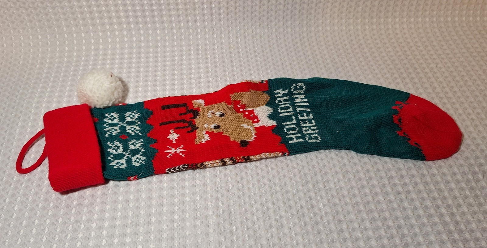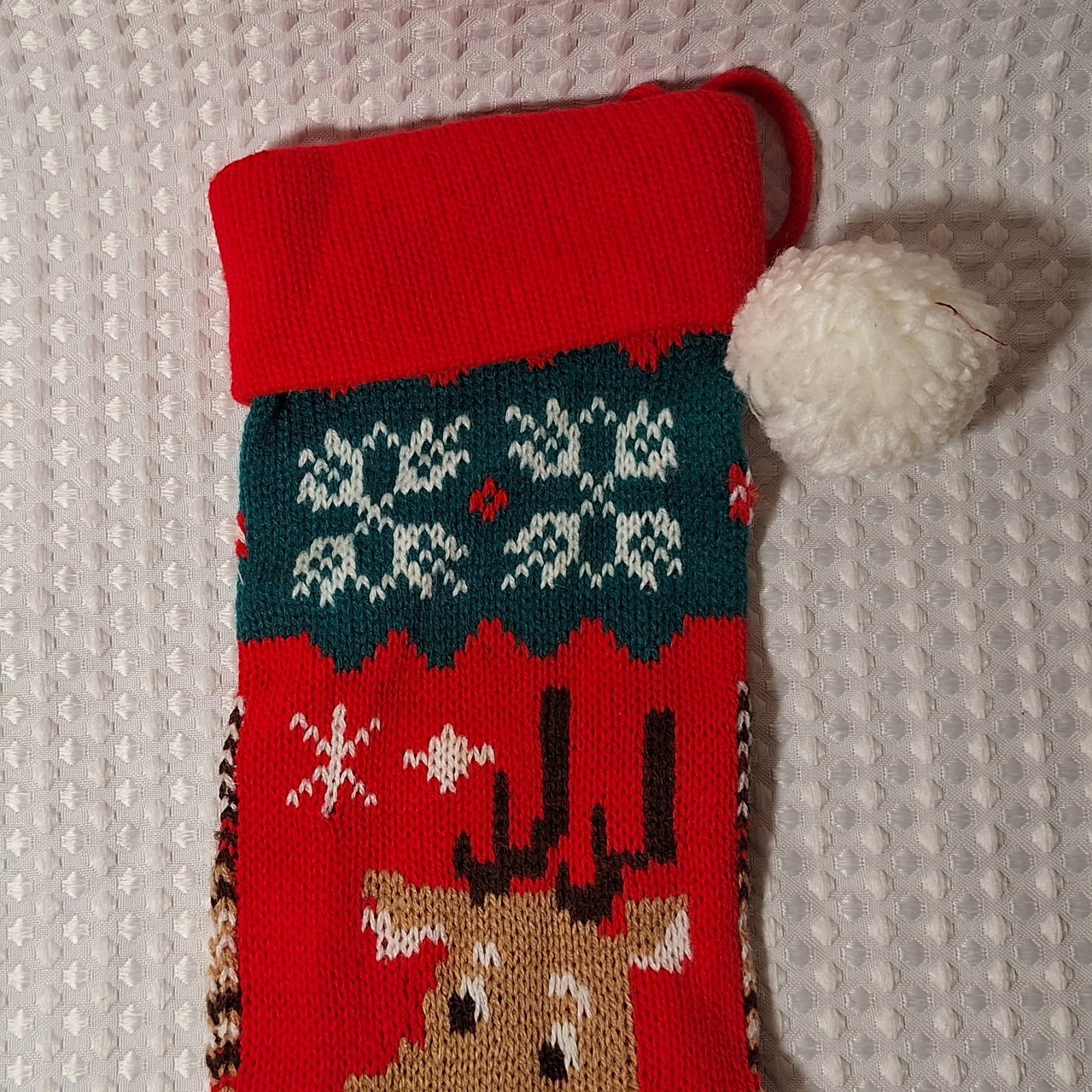 • Vintage Christmas Knit Stocking Reindeer 20 Long Holiday Greeting Red Green