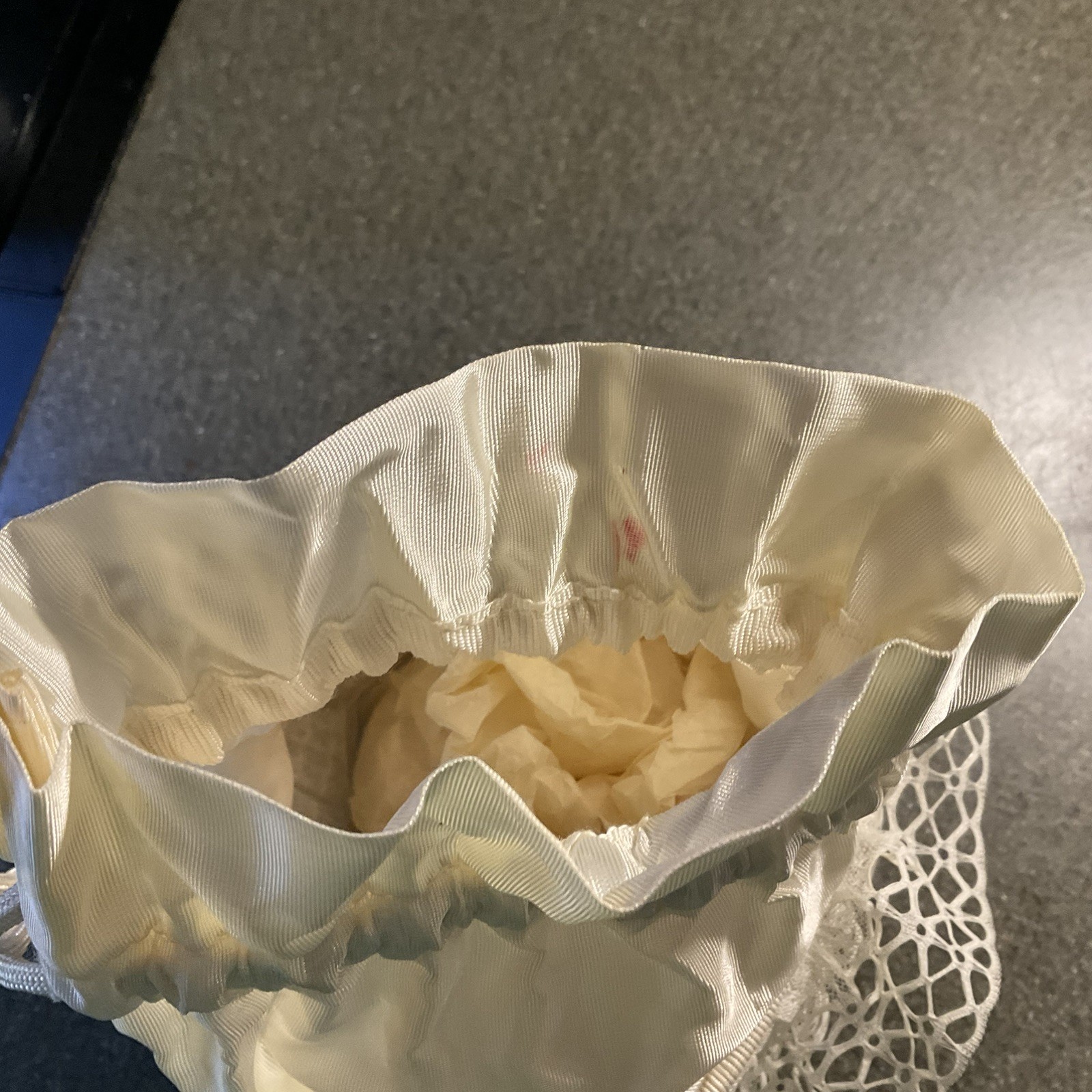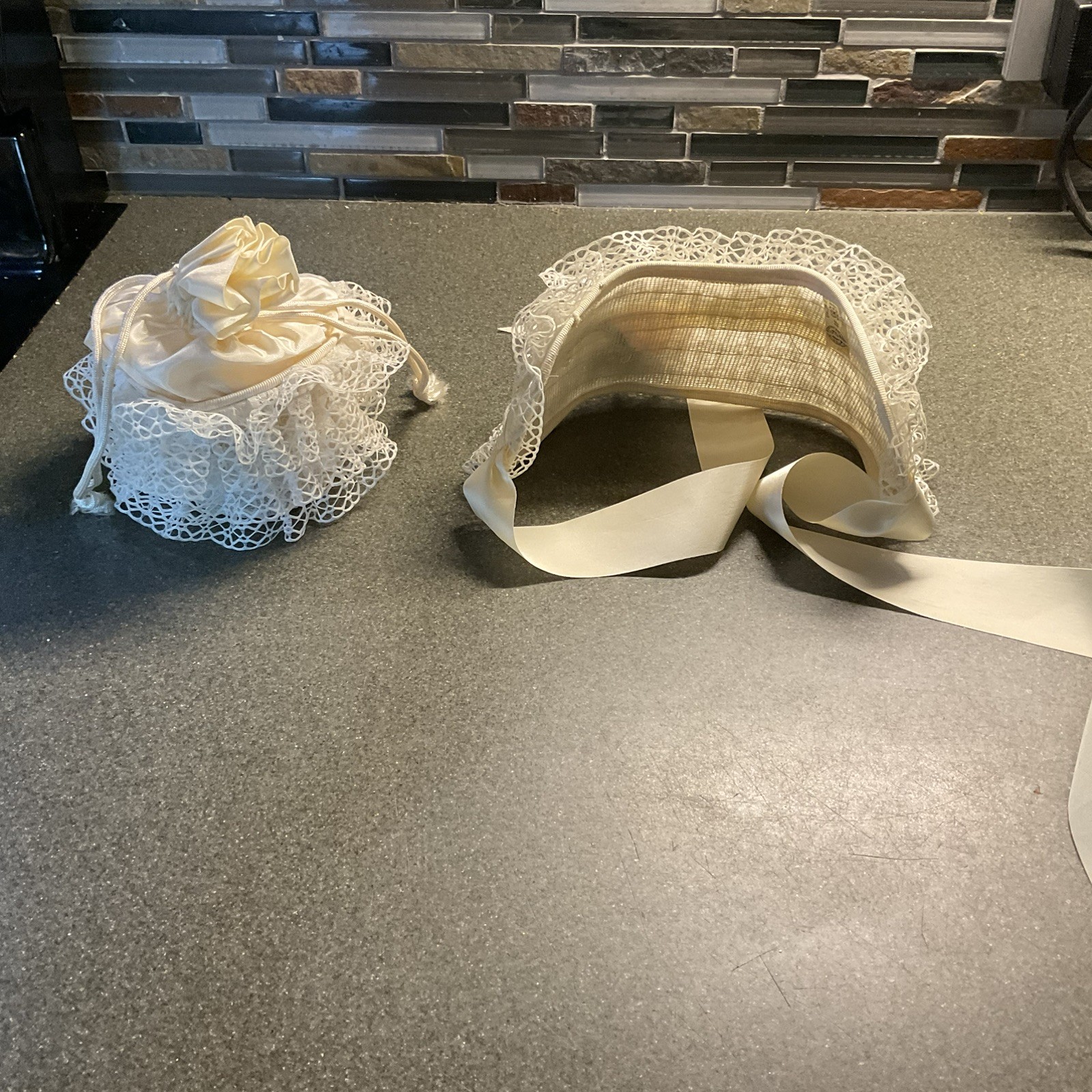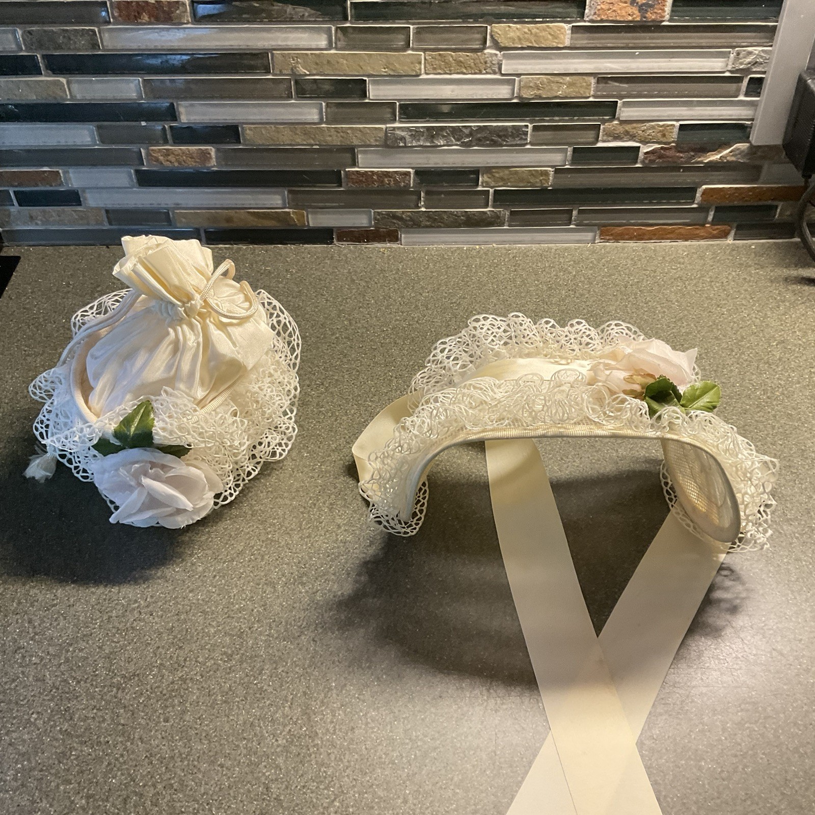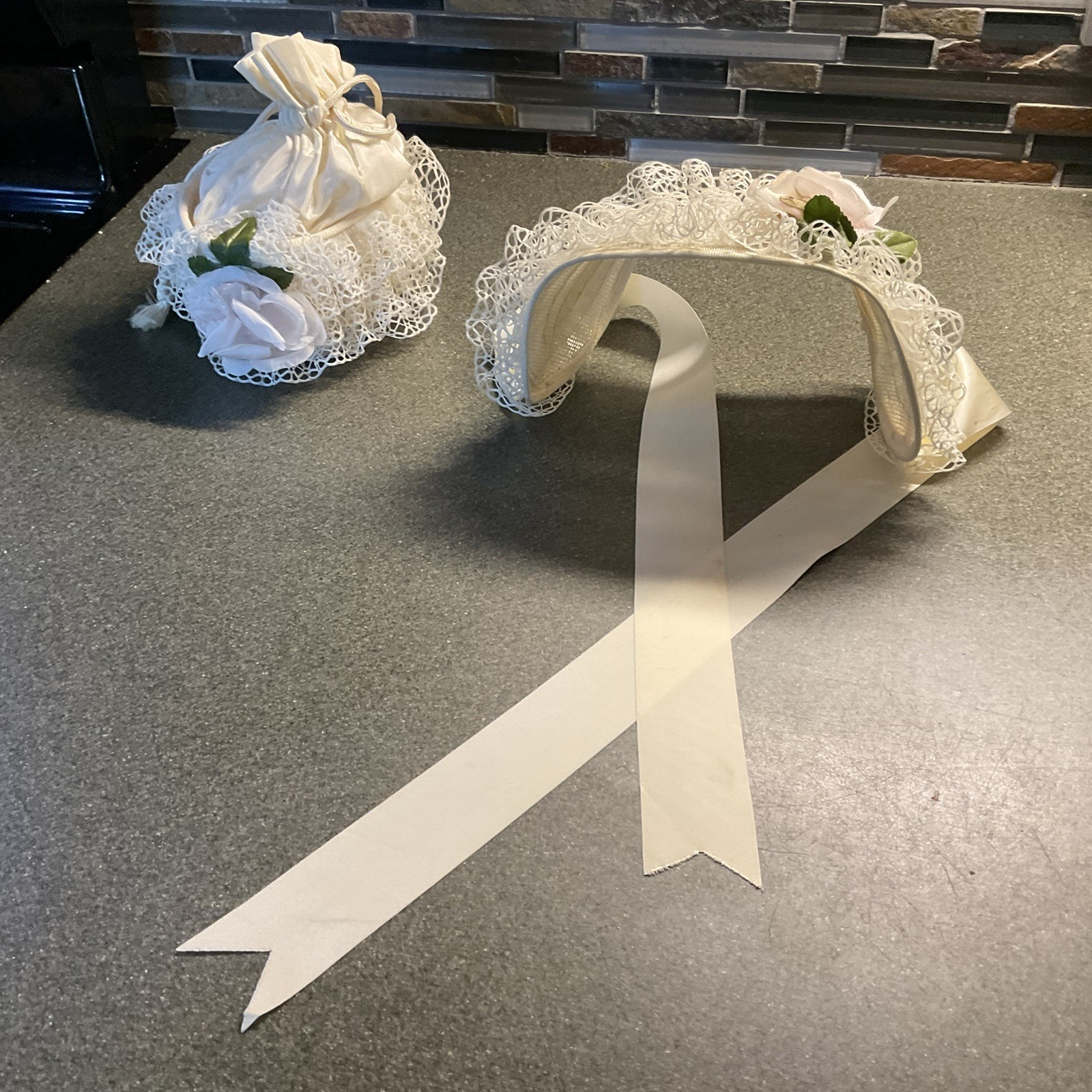 как выглядит 1950s Baby/Girl Cream Lace with Pink Roses Bonnet With Matching Drawstring Bag фото