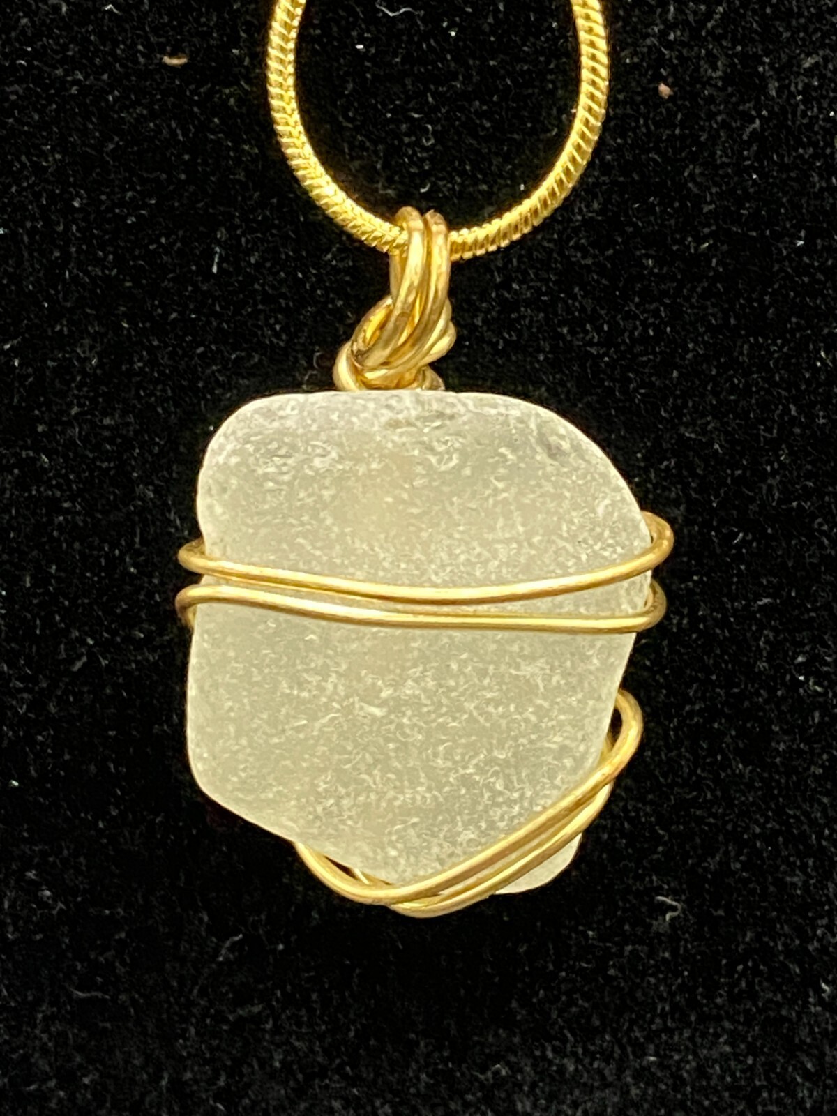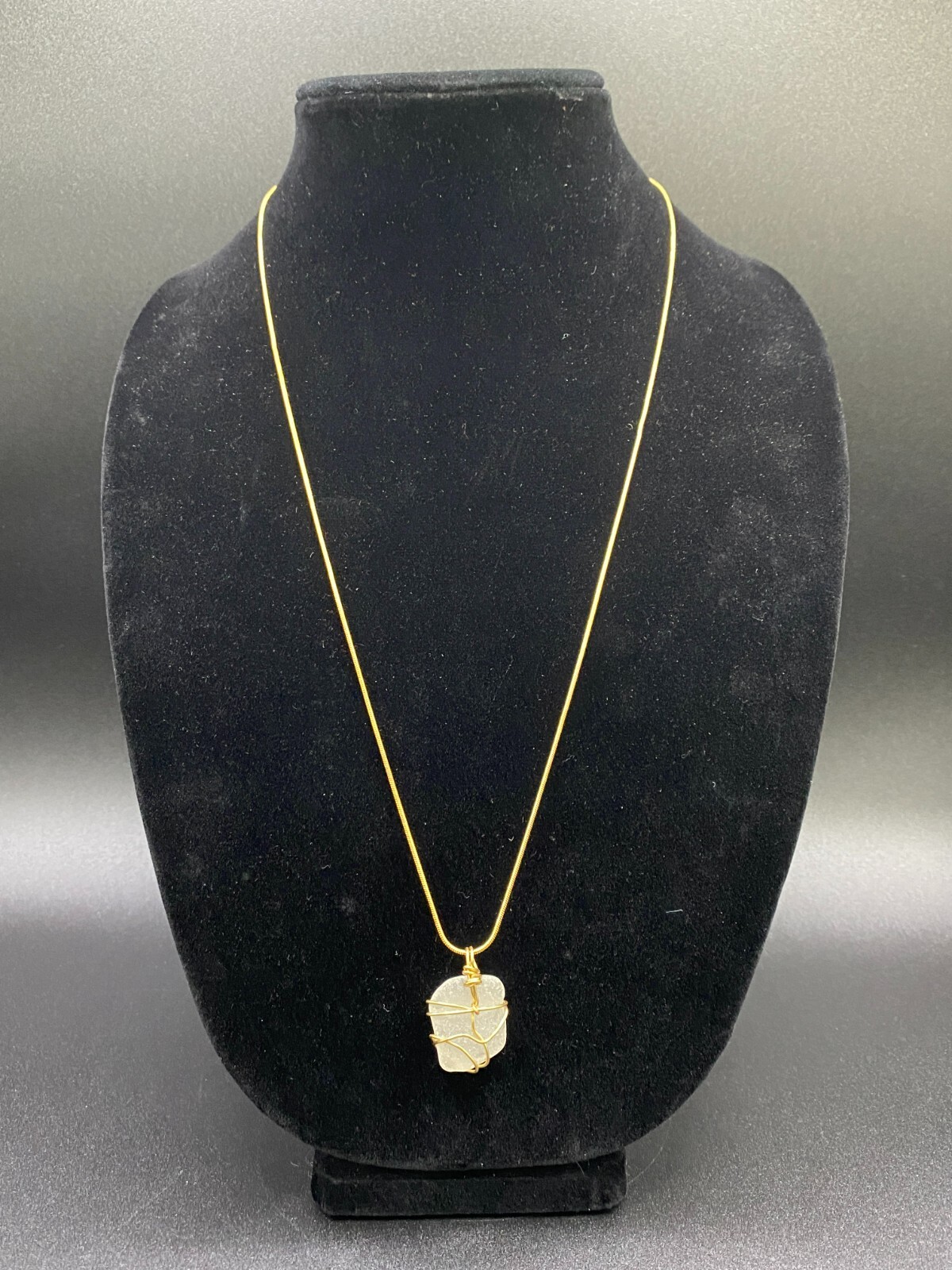 Gold Tone Wire Wrapped White Sea Glass Pendant Necklace
