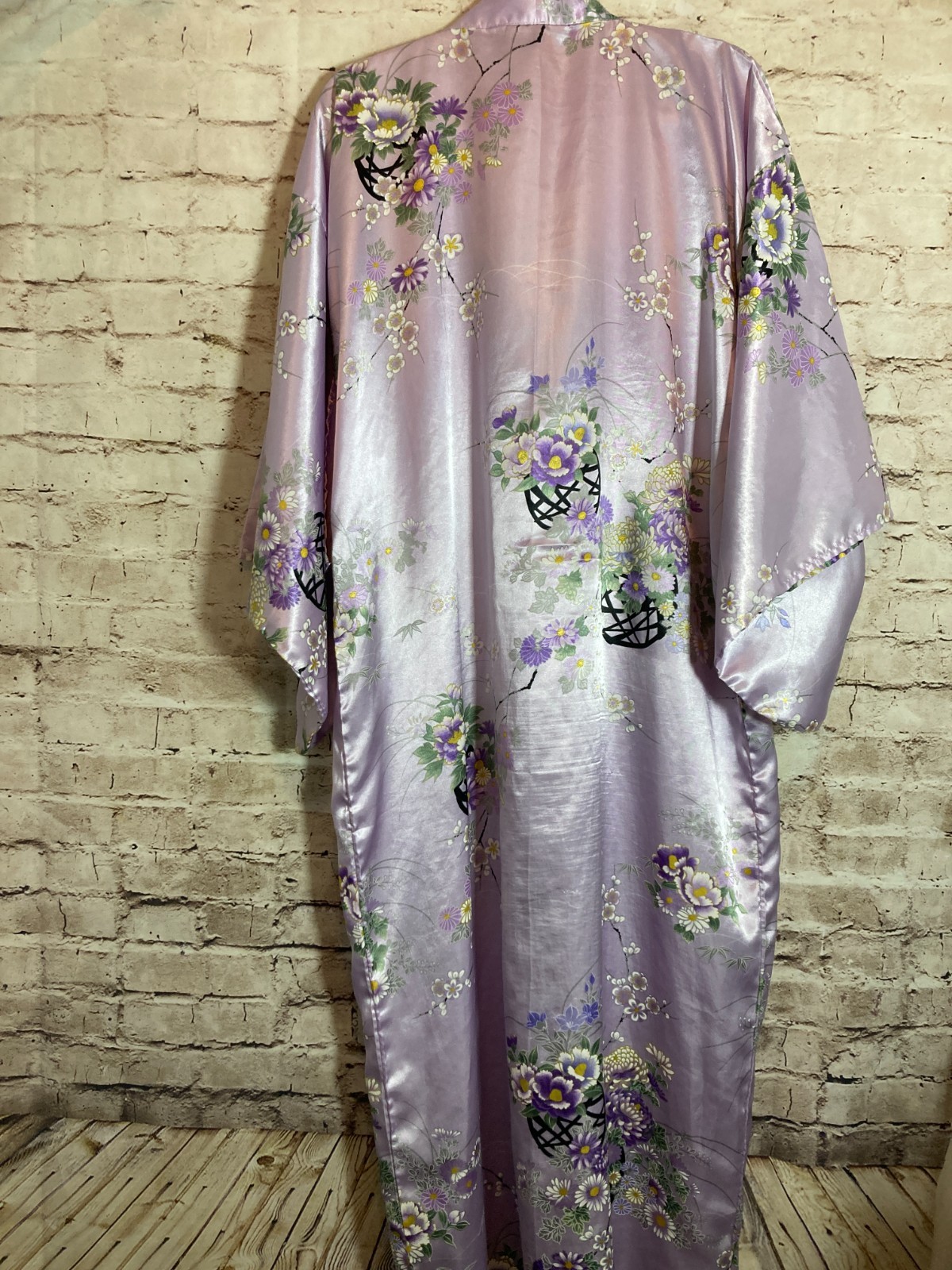 как выглядит Vintage Authentic Japanese Kimono Robe XL Lilac Purple Satin Floral Open Front фото
