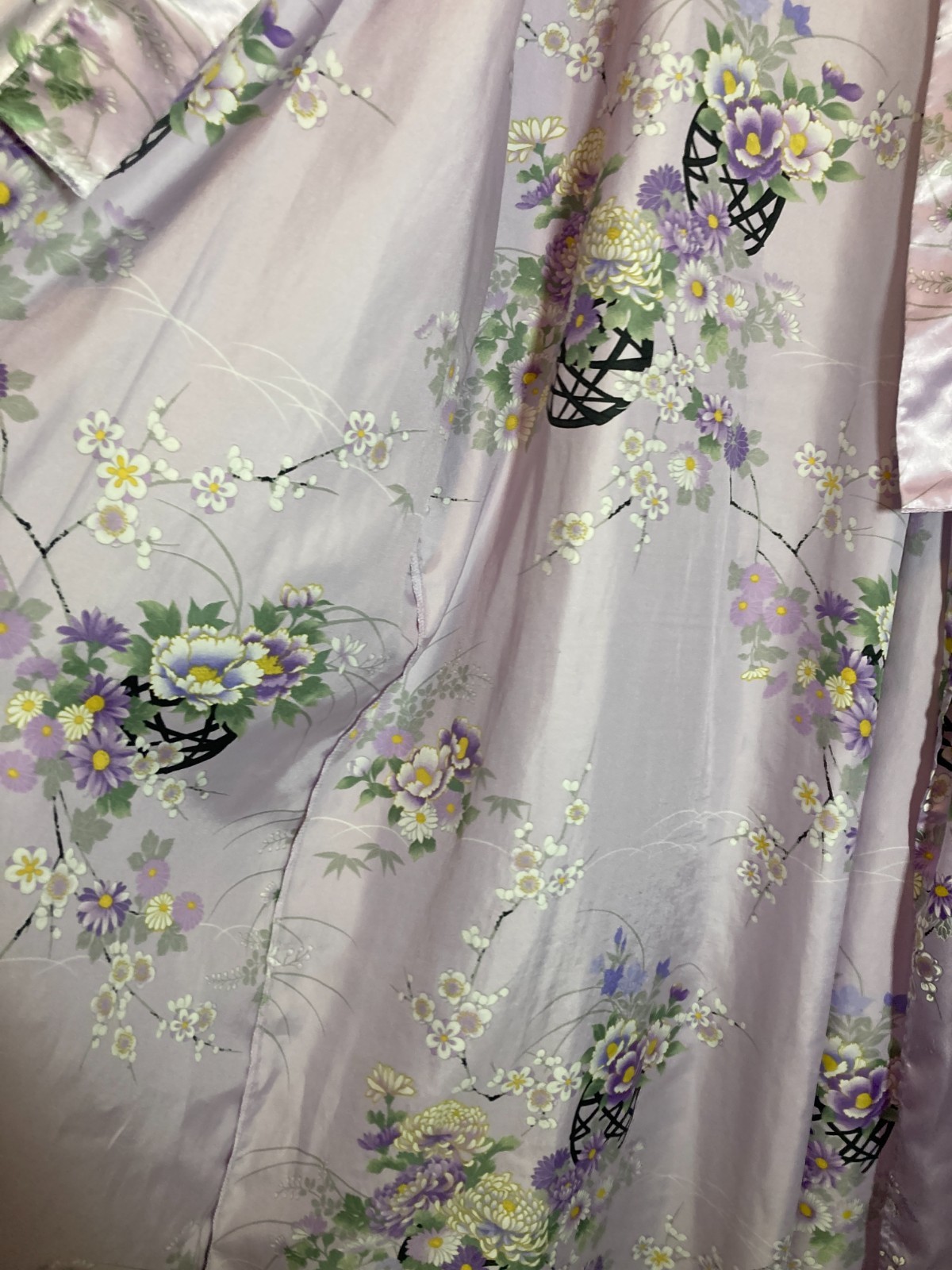 Vintage Authentic Japanese Kimono Robe XL Lilac Purple Satin Floral Open Front