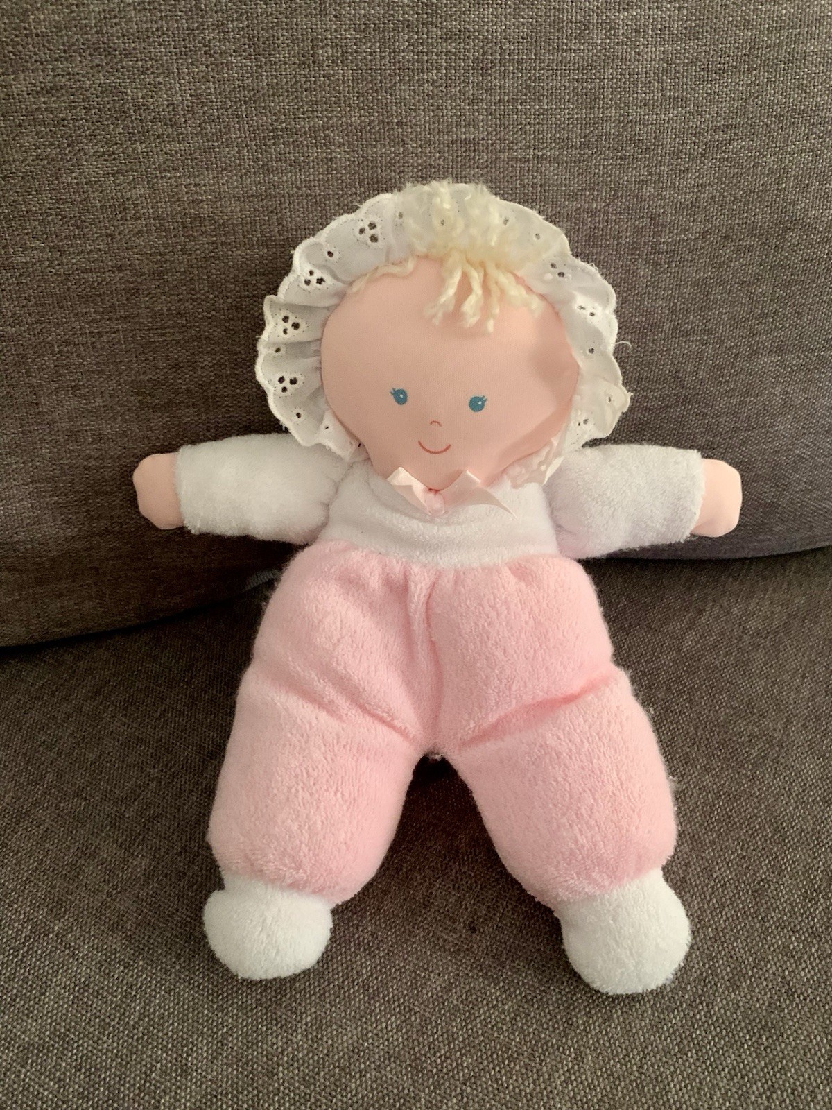 как выглядит Vintage Eden Pink White Doll Terry Cloth Blue Eyes Bonnet Lace Soft Plush 10 Toy фото