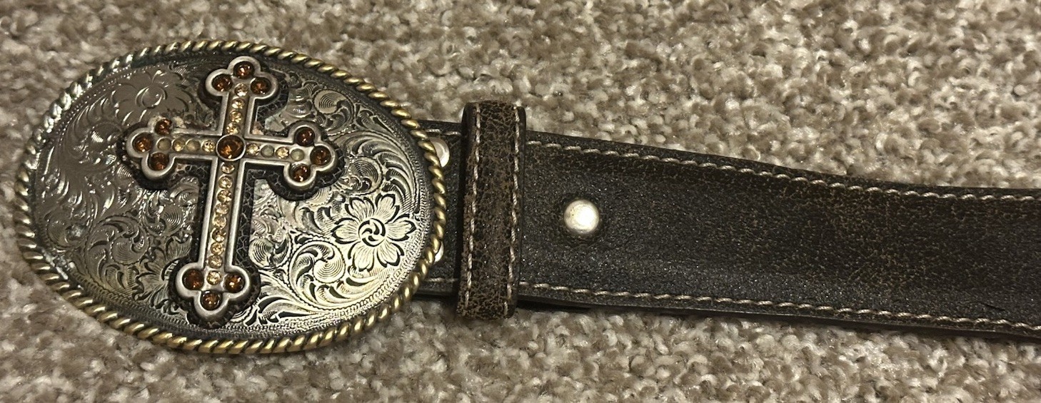 как выглядит Cross W/ Brown Rhinestone Religious Western Nocona Size M 31 -35 Belt Buckle фото