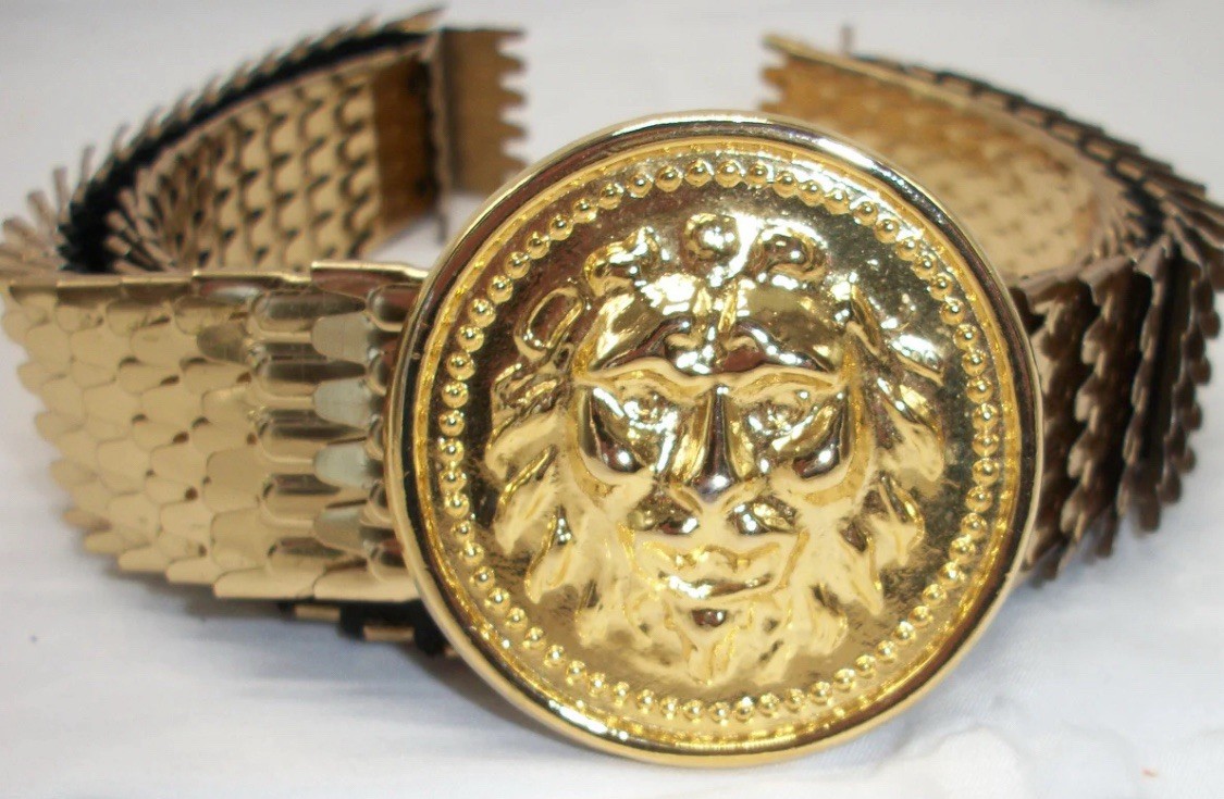 как выглядит 1990 vintage gold tone lion s head medallion stretch belt, Metal scales фото
