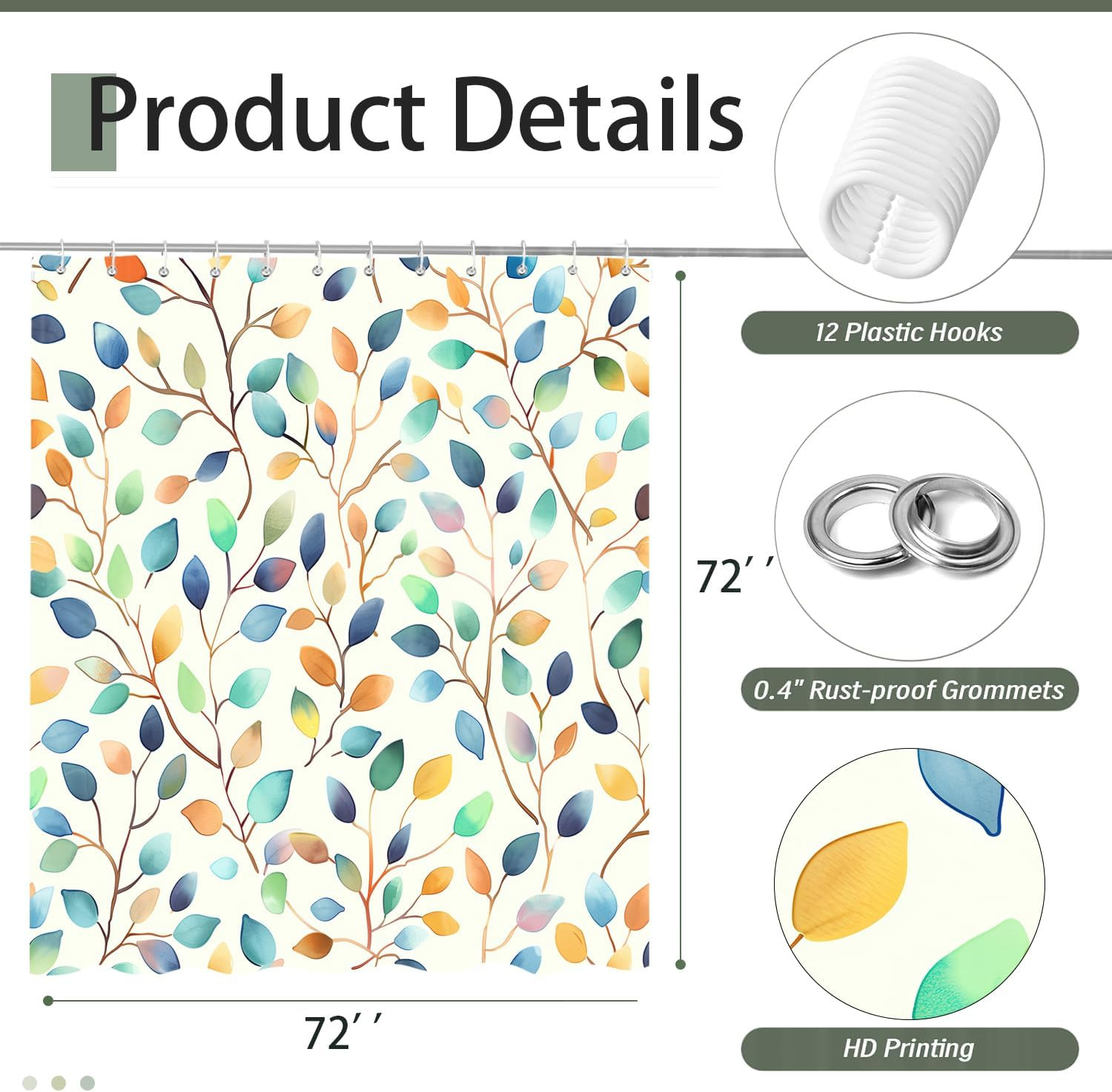 Boho Floral Shower Curtain, Modern Nature Aesthetic Colorful Leaves Shower Curta