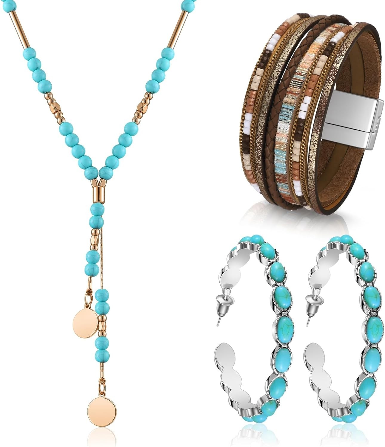 Boho Turquoise Jewelry Set - Long Choker, Dangle Earrings Layered Bracelet