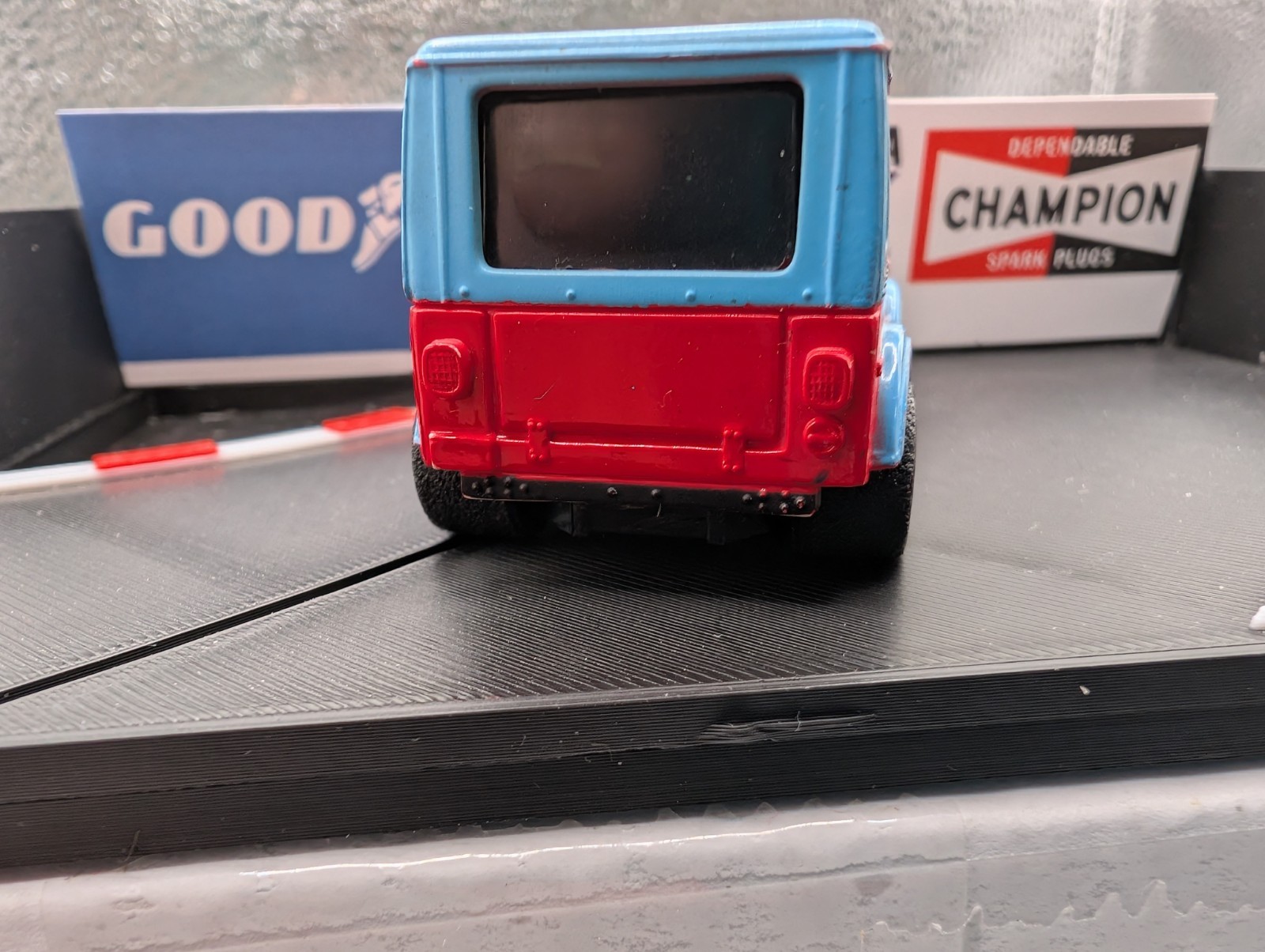 1990's Tyco 440-X2 HO Scale Slot Car Chassis/1980 Jeep CJ-7 Red With Blue Trim