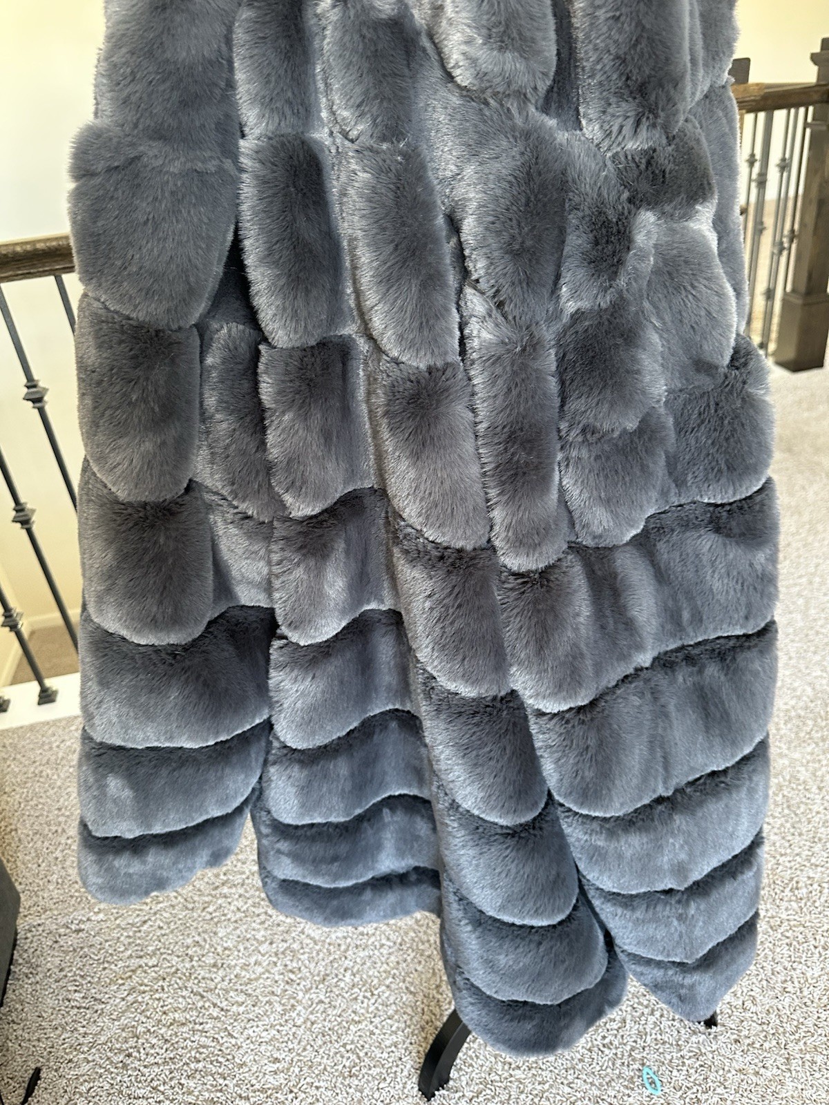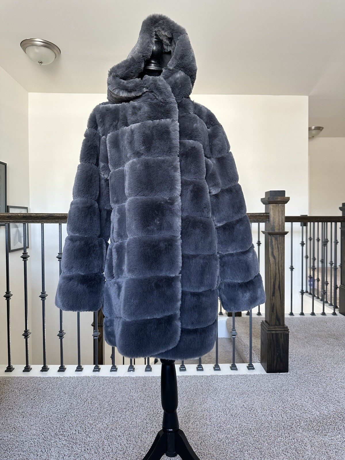 как выглядит BCBGMAXAZRIA Faux Fur Hooded Coat  Charcoal Gray, Size L, NWT фото