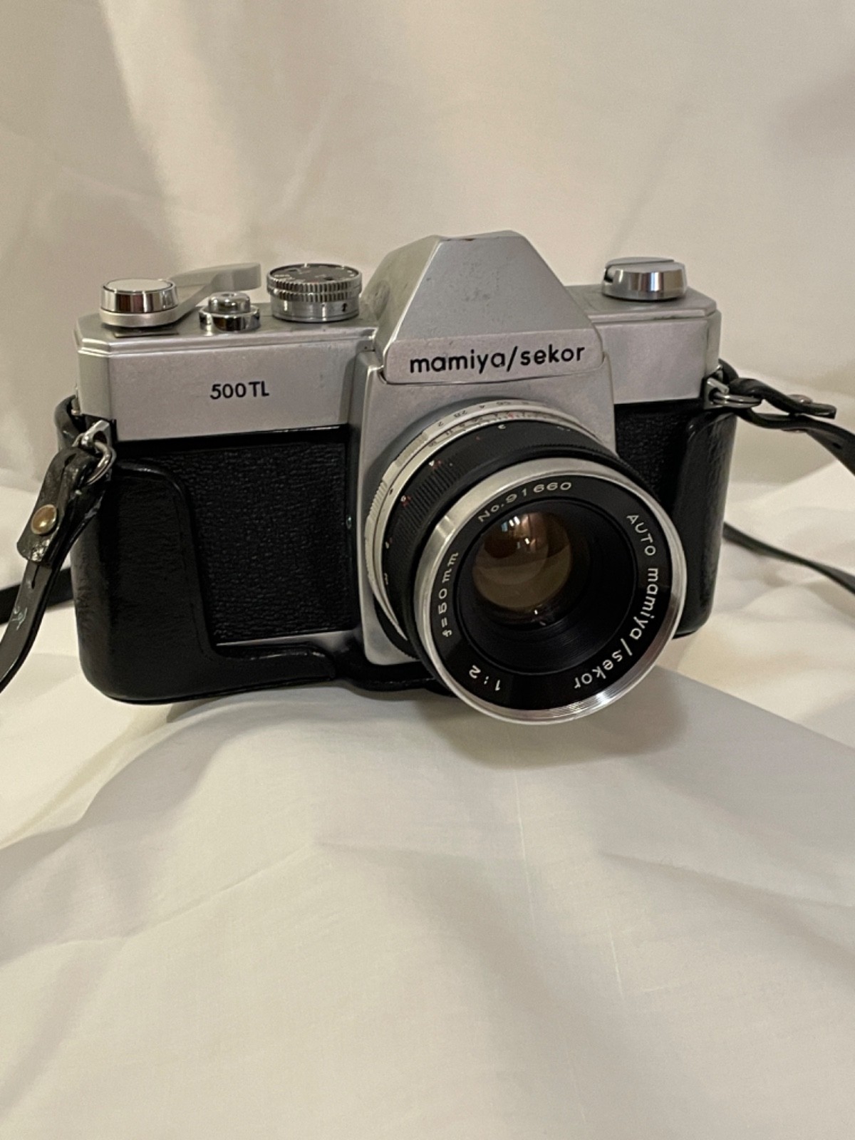 Mamiya/Sekor 500TL 35mm Film Camera, Leather Case, Auto 1:2.8 50mm Lens UNTESTED
