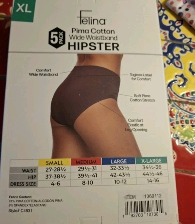 Felina Pima Cotton Wide Waistband Hipster 5 Pack Women's Sz XL NEW