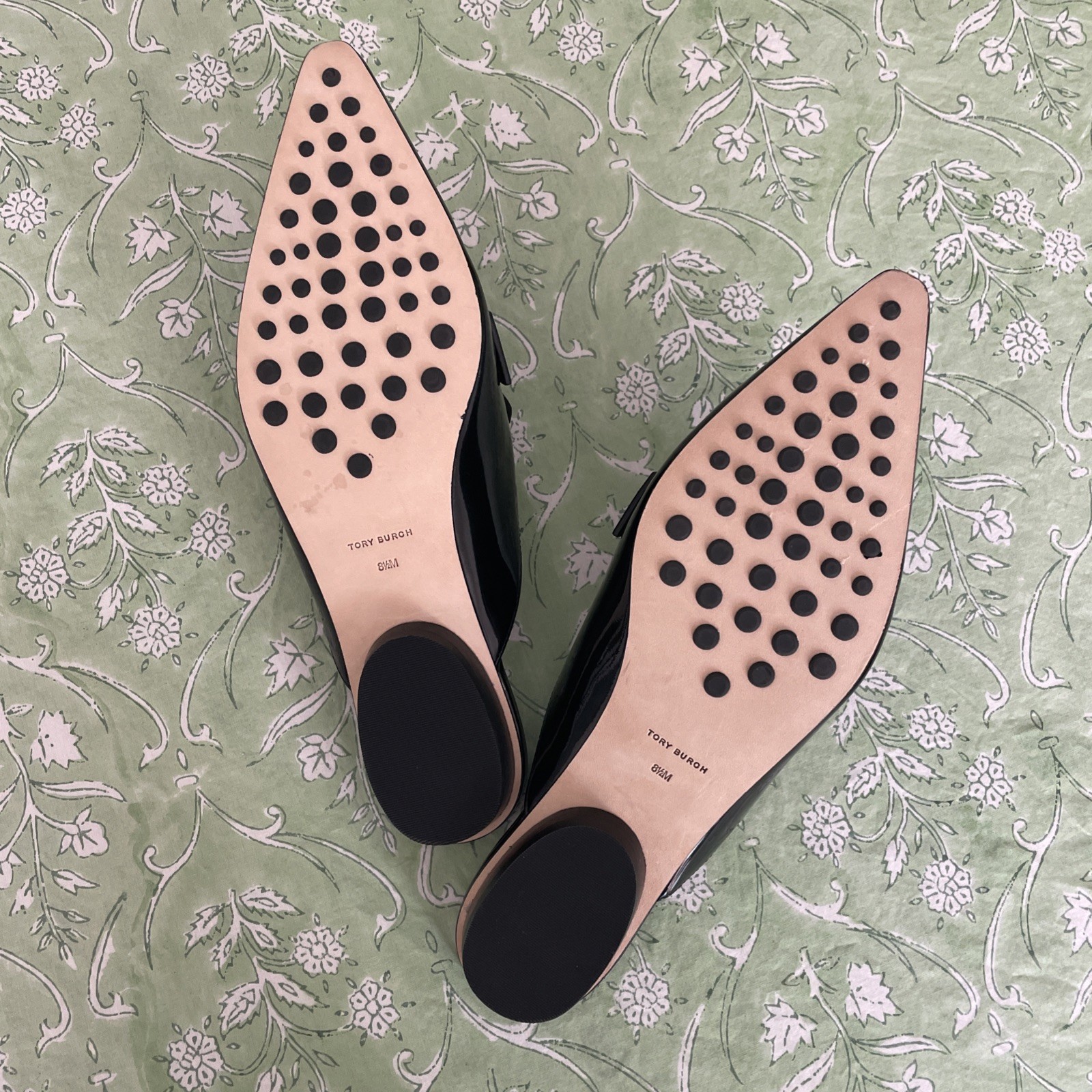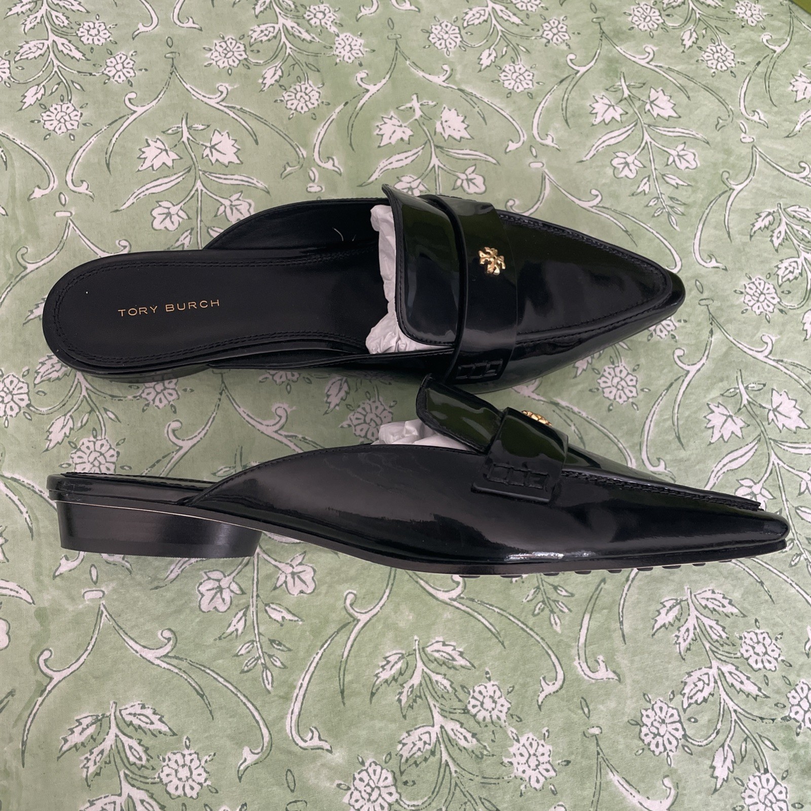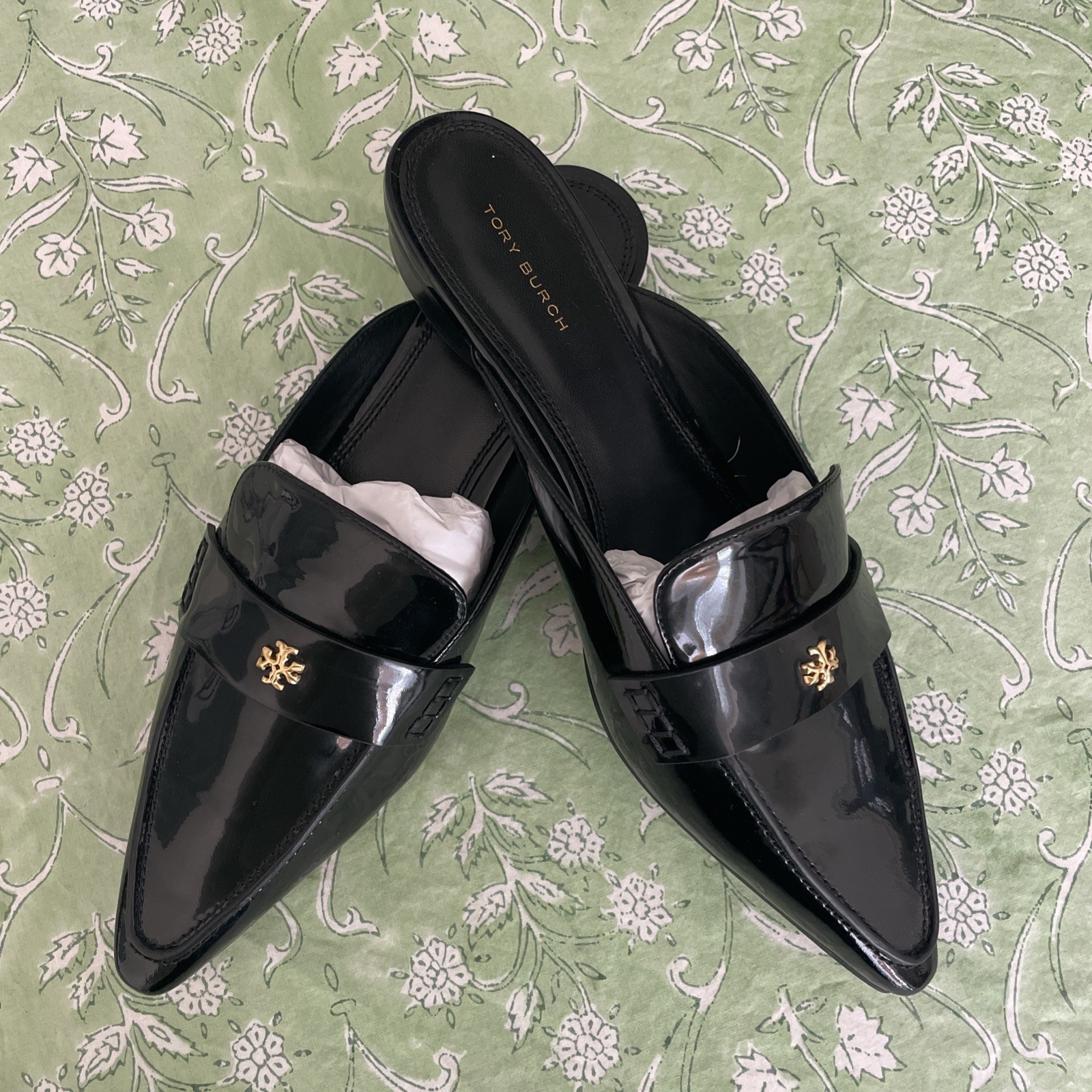 как выглядит NEW Tory Burch Pointed Toe Black Patent Leather Mules 8.5 NIB with Dust Bag фото