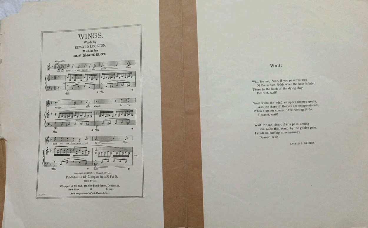 Guy D'Hardelot/Arthur L Salmon-Wait 1916 Sheet Music. Chappell Co Ltd 6689.