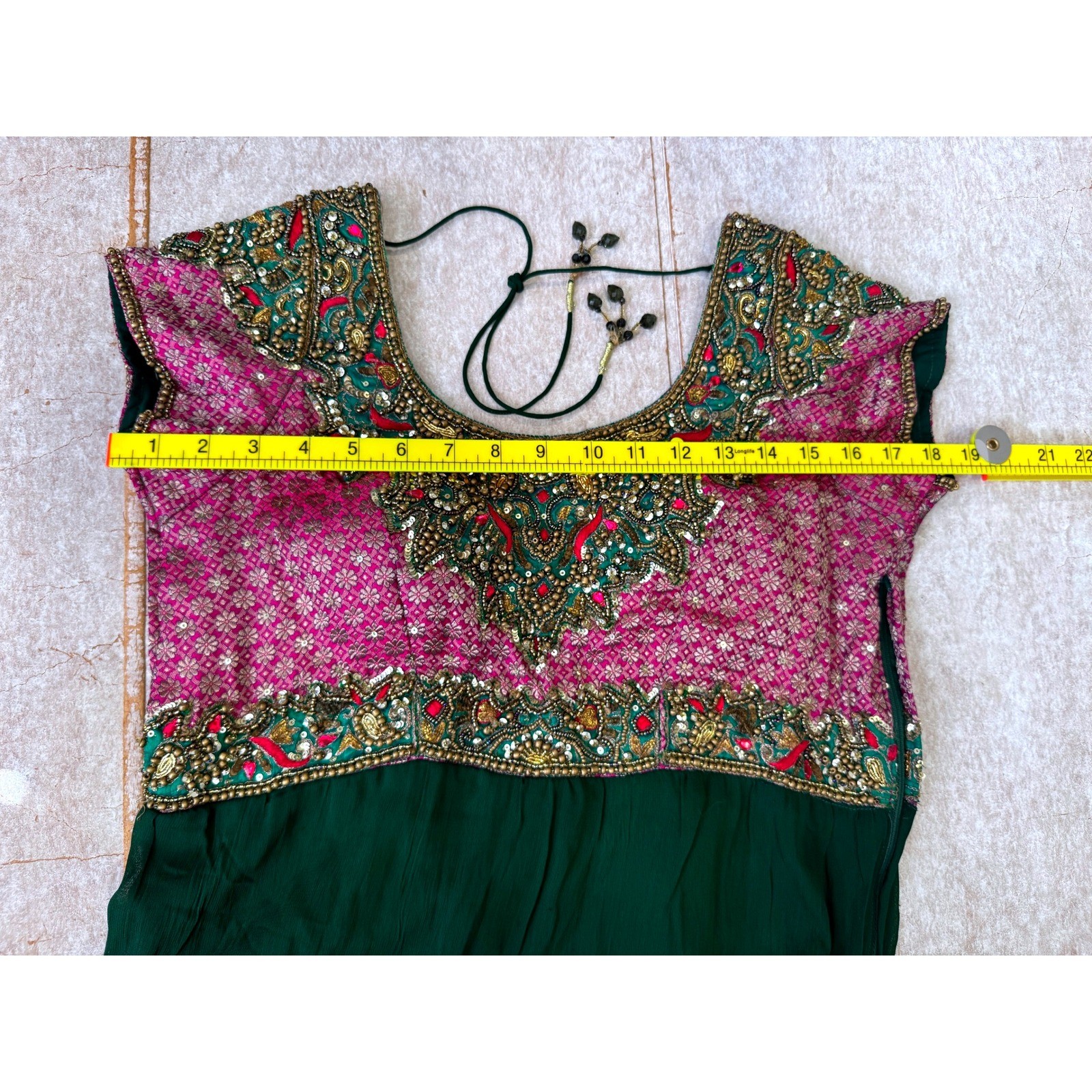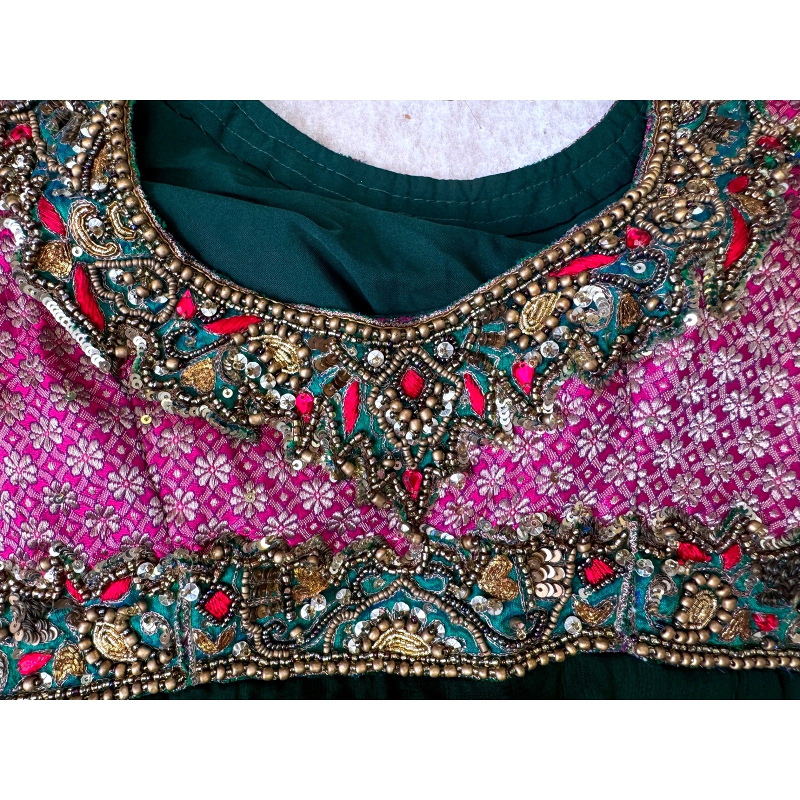 Embroidered Beaded Indian Dress Green Pink Heavy Formal Occasion wear EUC