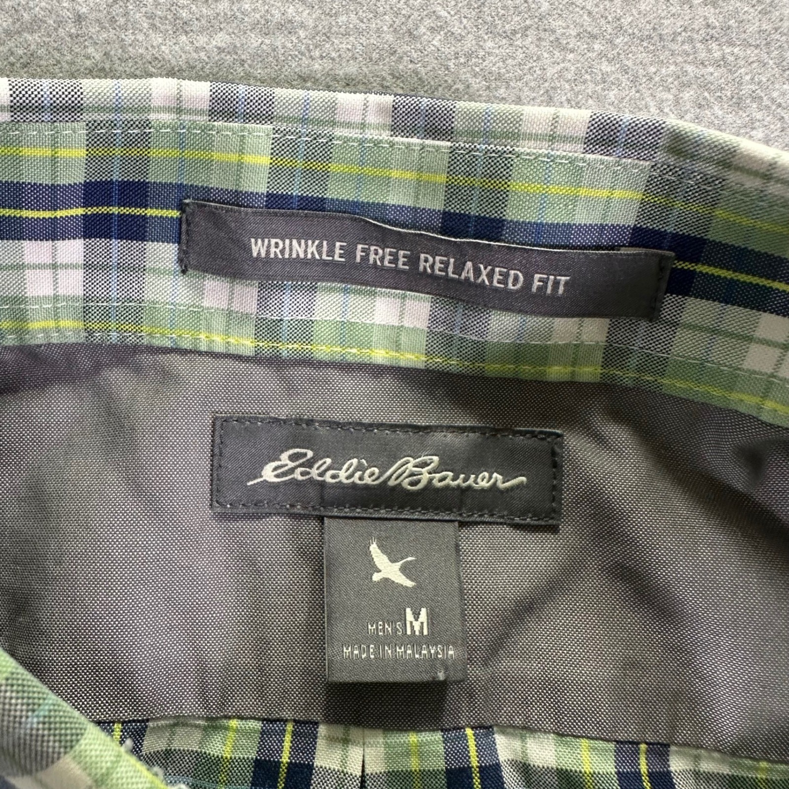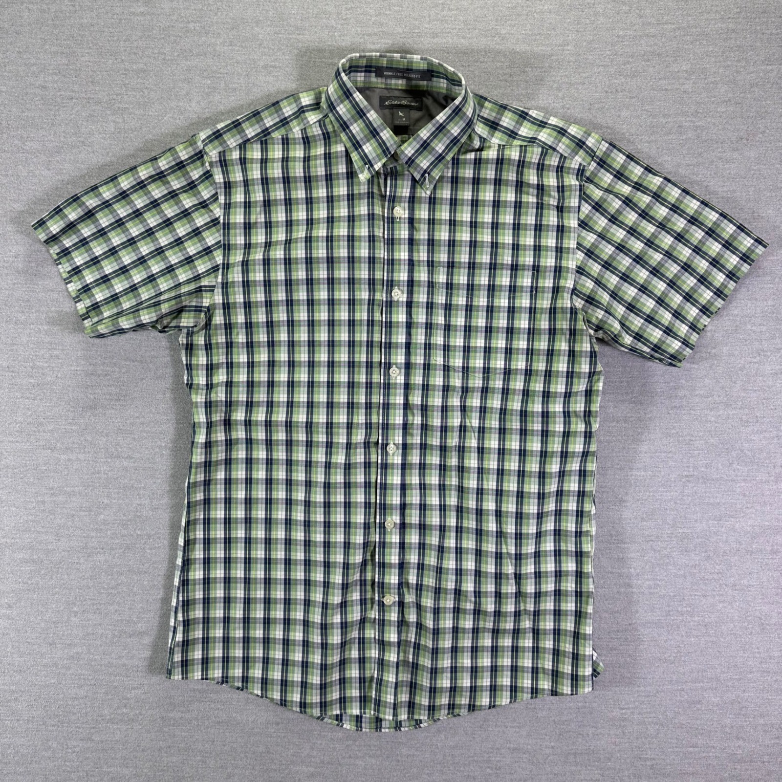 Eddie Bauer Plaid Button Down Shirt Men's Medium Green Short Sleeve Wrinkle Free