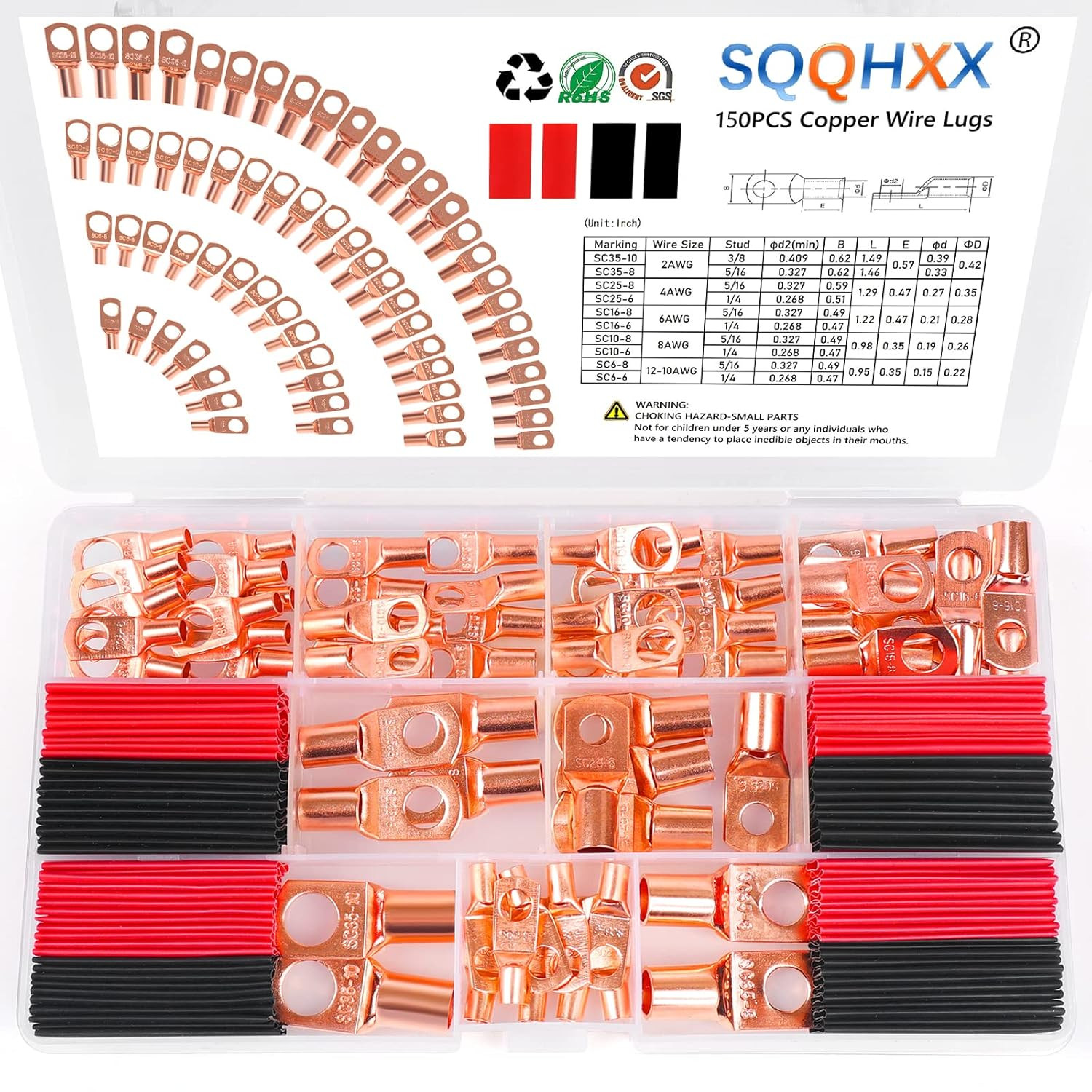 150Pcs Copper Wire Lugs, Battery Cable Ends AWG 2 4 6 8 10 12 Gauge Wire Connect