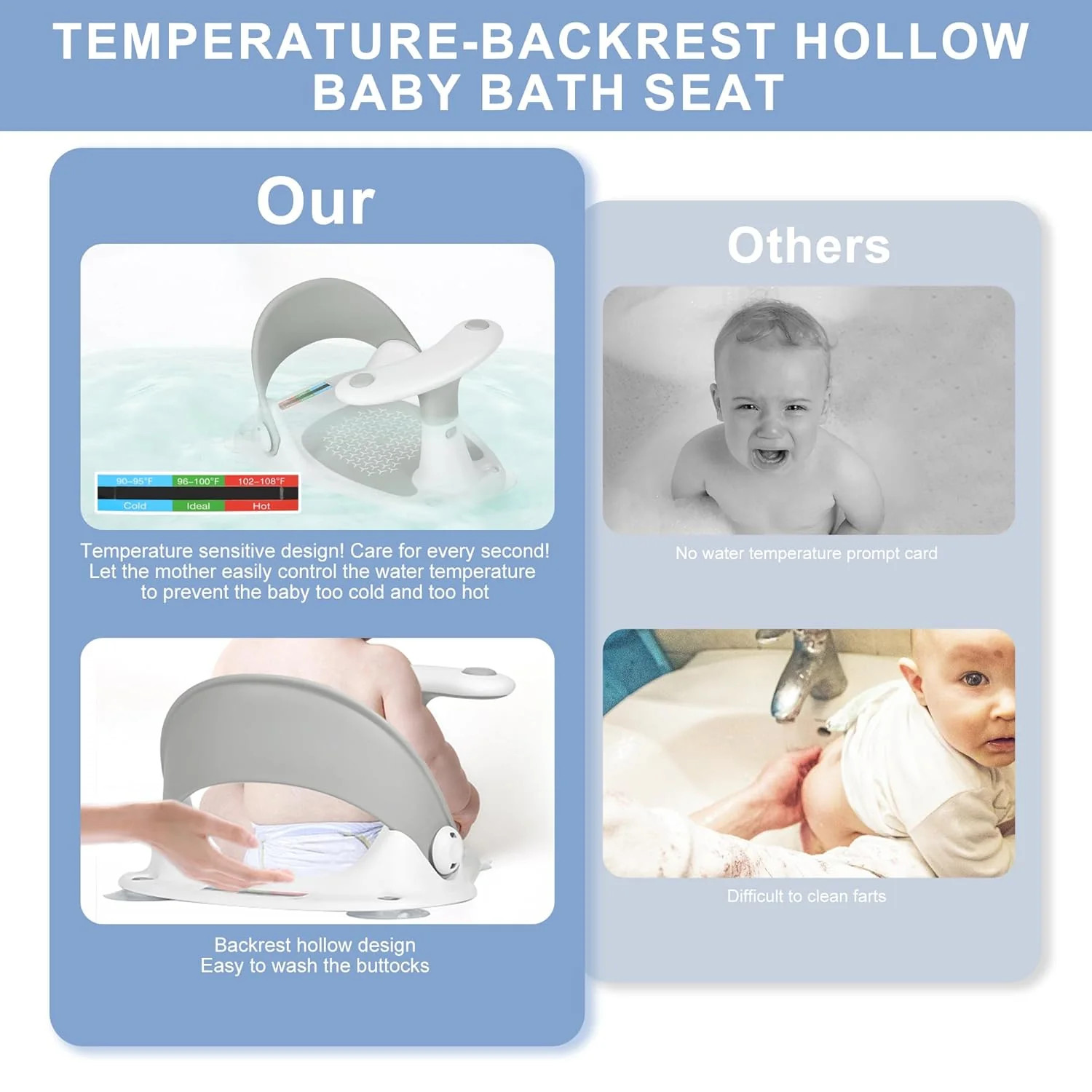 Baby Bath Seat with Thermometer, Non-Slip Toddler Chair for 6-24 Months, Gray