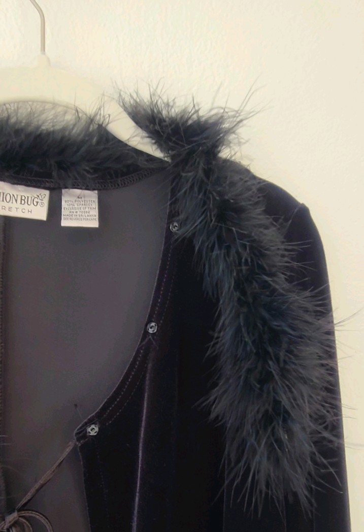 Vintage Black Velvet Robe With a Faux Feather Trim. Romantic Coquette. size M.