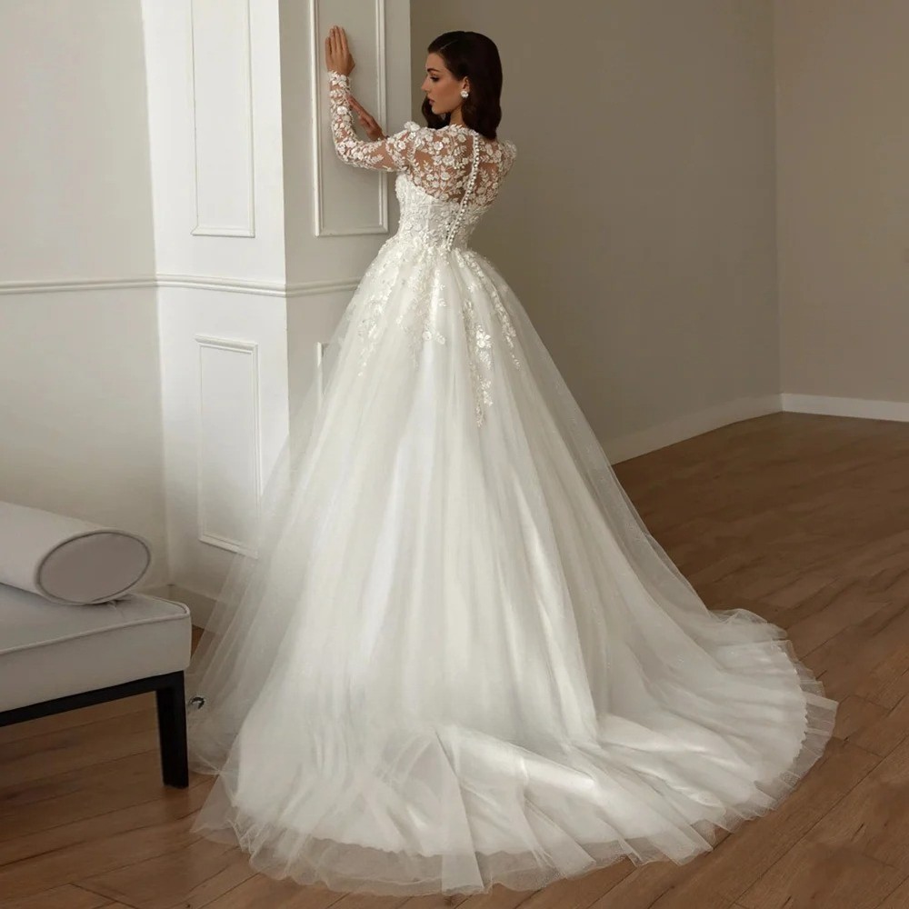 Elegant Wedding Dress Long Sleeve Sequine Applique Tulle Sweep Train Bridal Gown