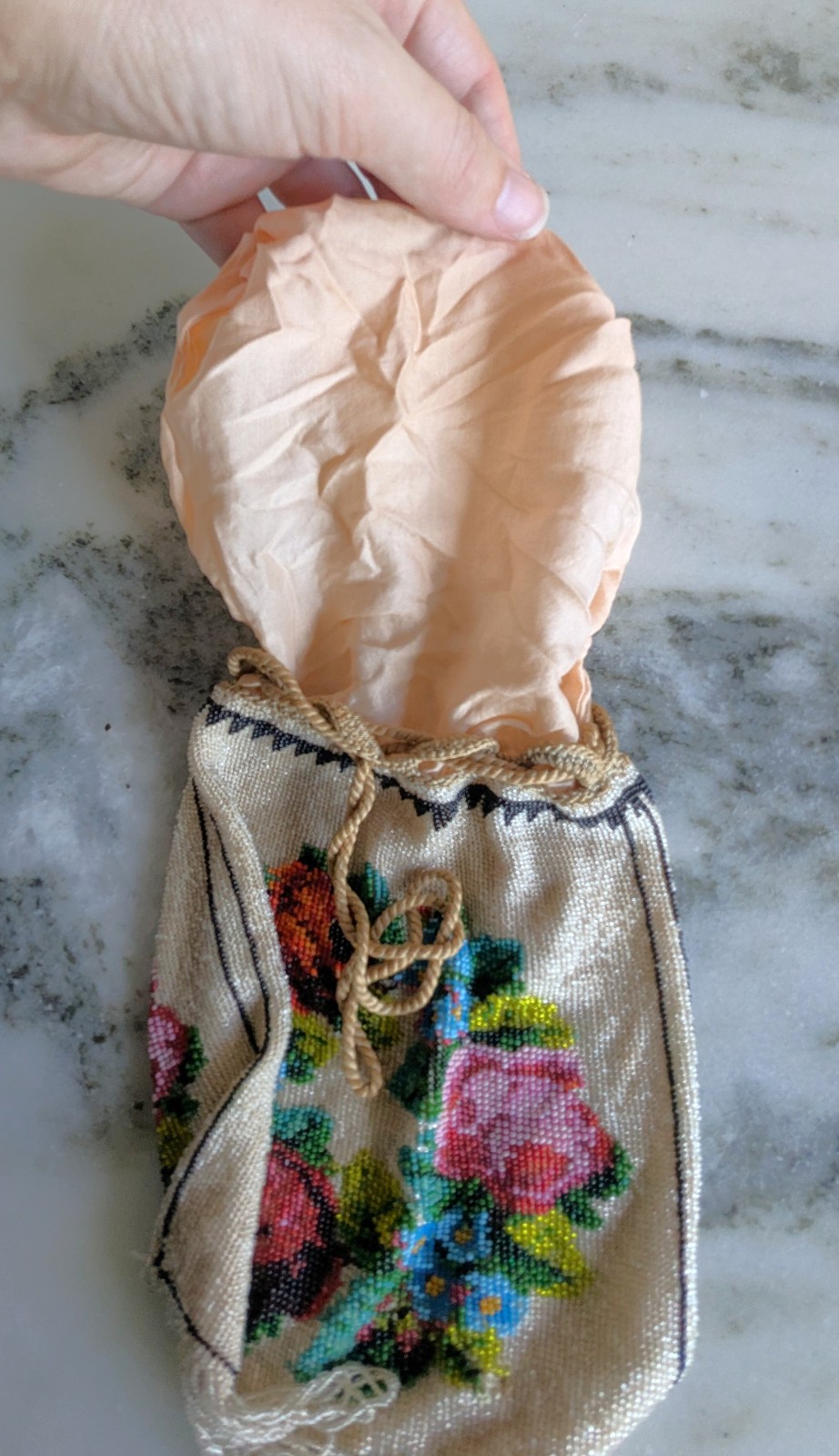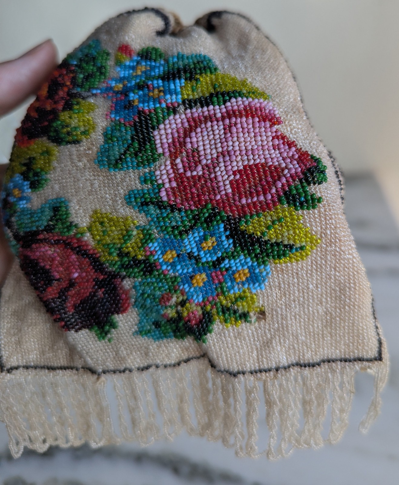 Antique Victorian Crochet Rose Floral Micro Bead Drawstring Purse Excellent