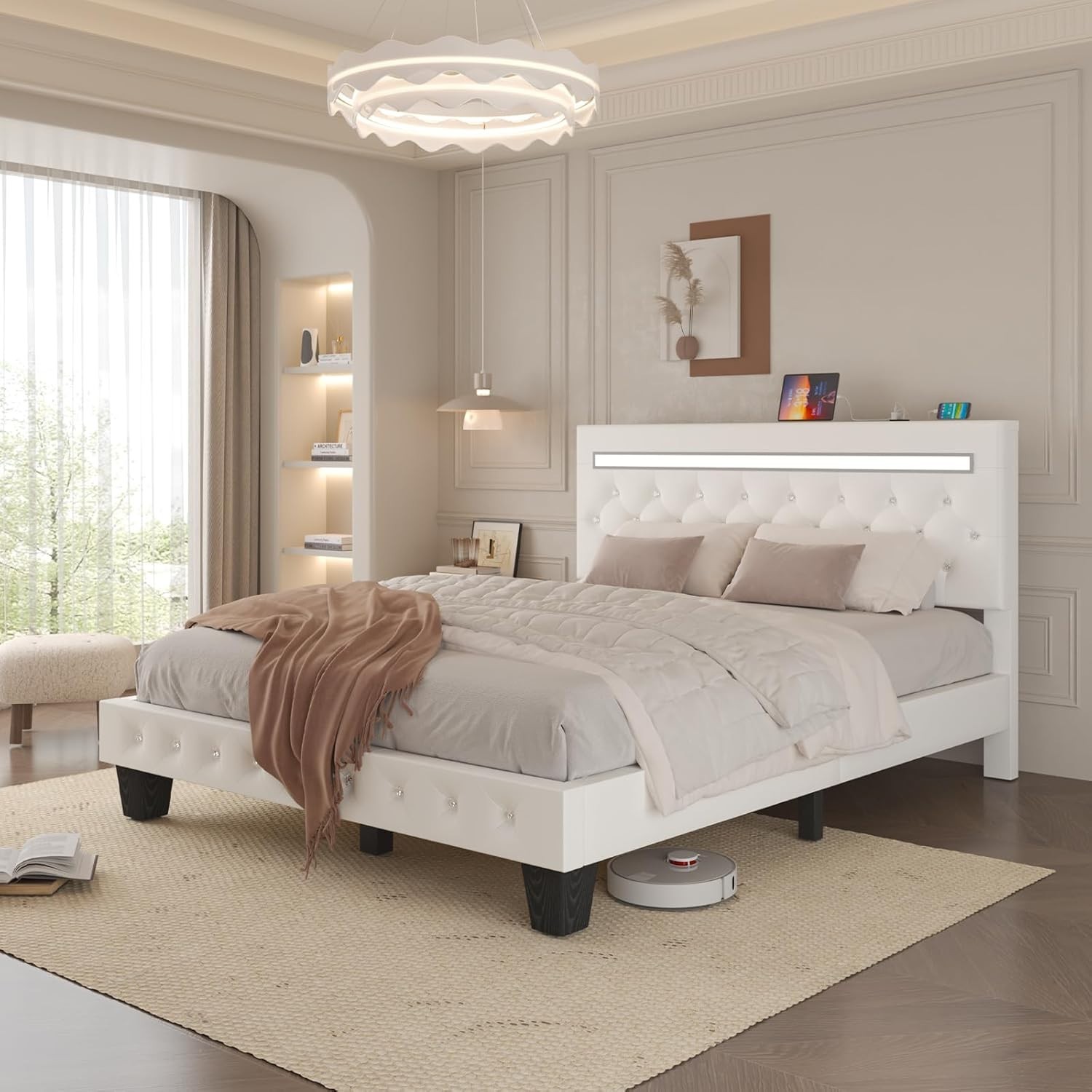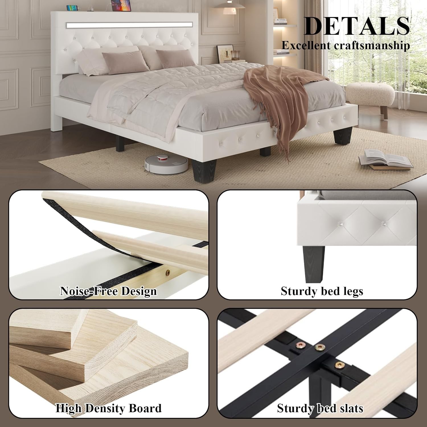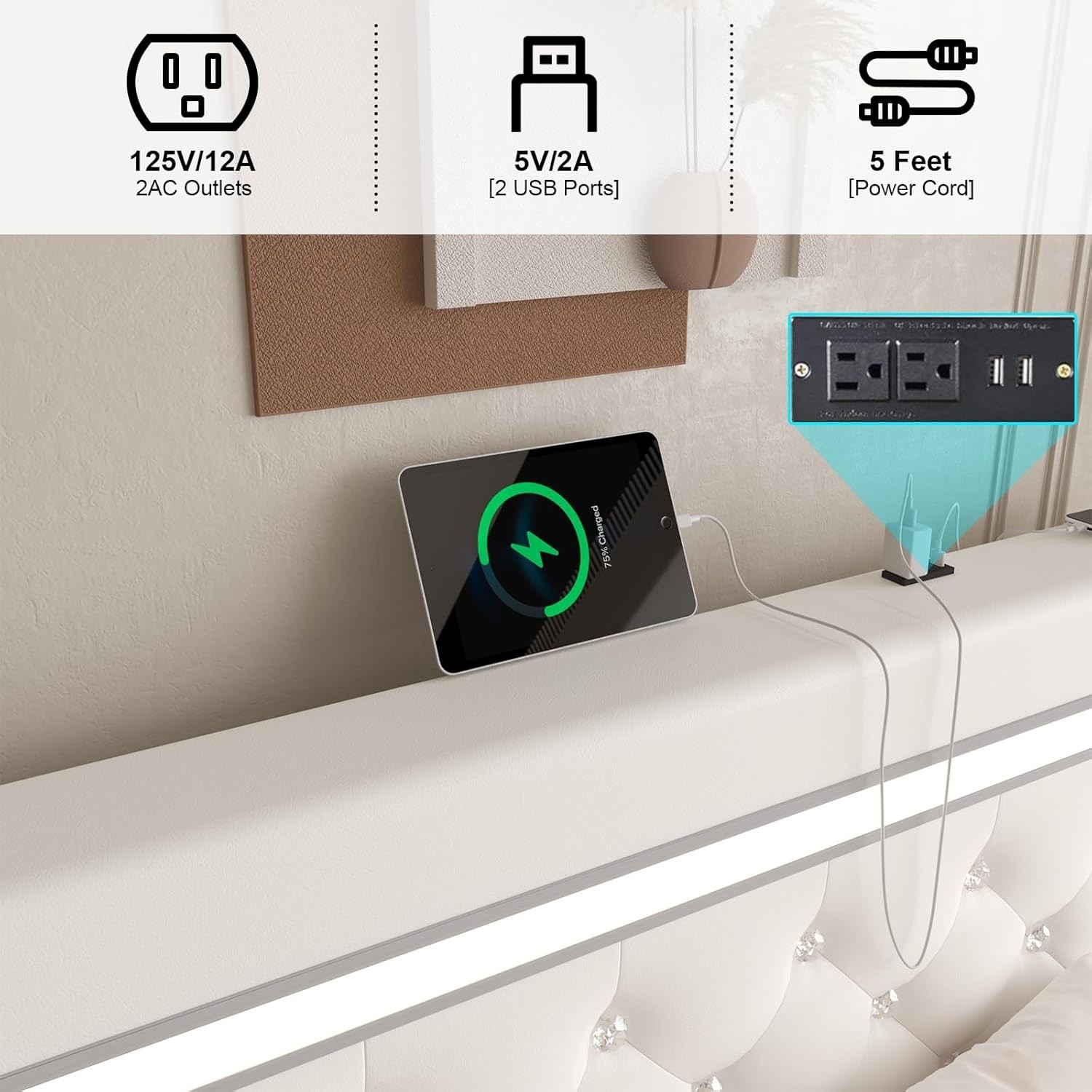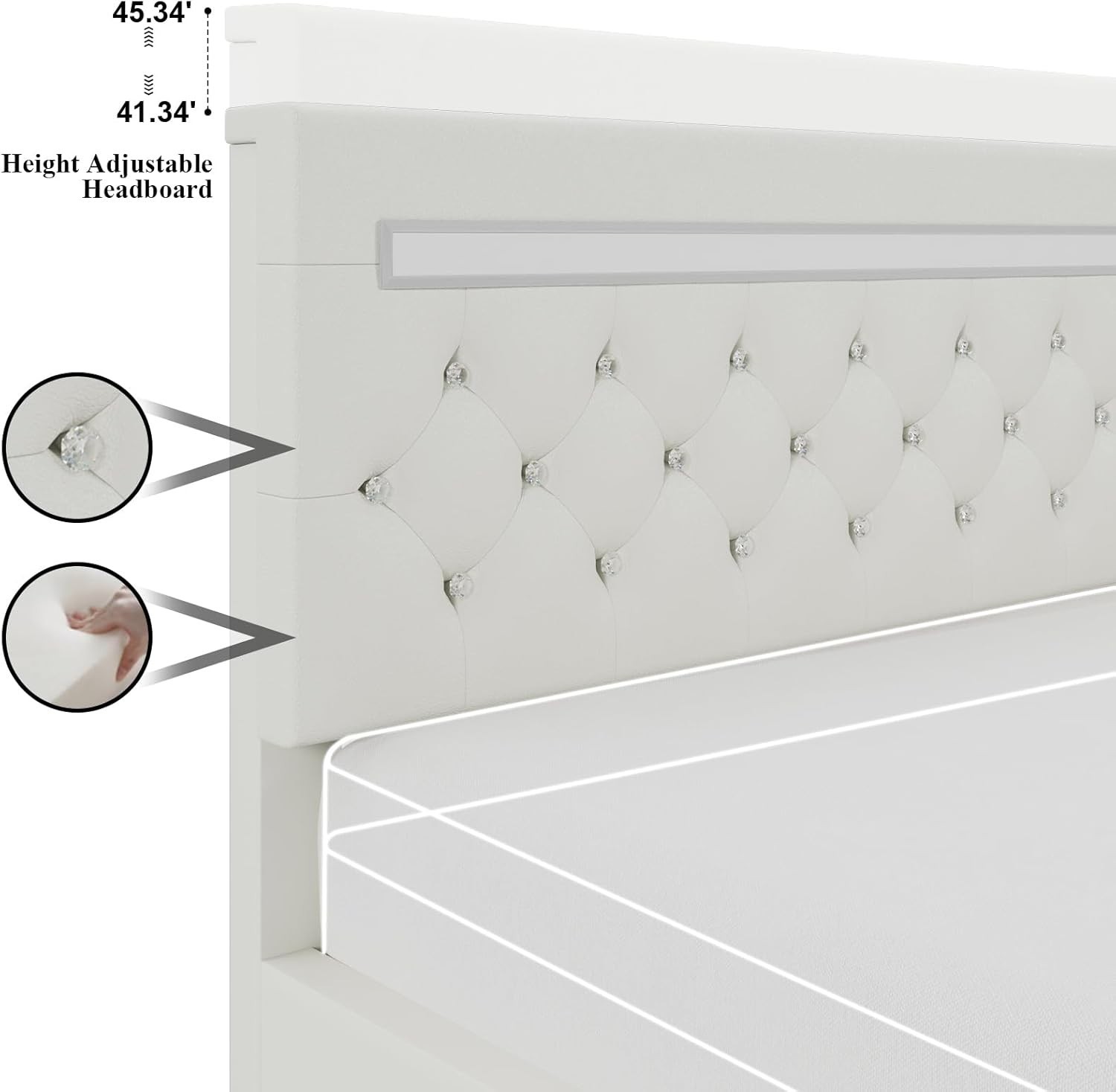 Особенности: LED Light, Adjustable Headboard, Crystal Tufted Button, No Box Spring Needed, USB Port