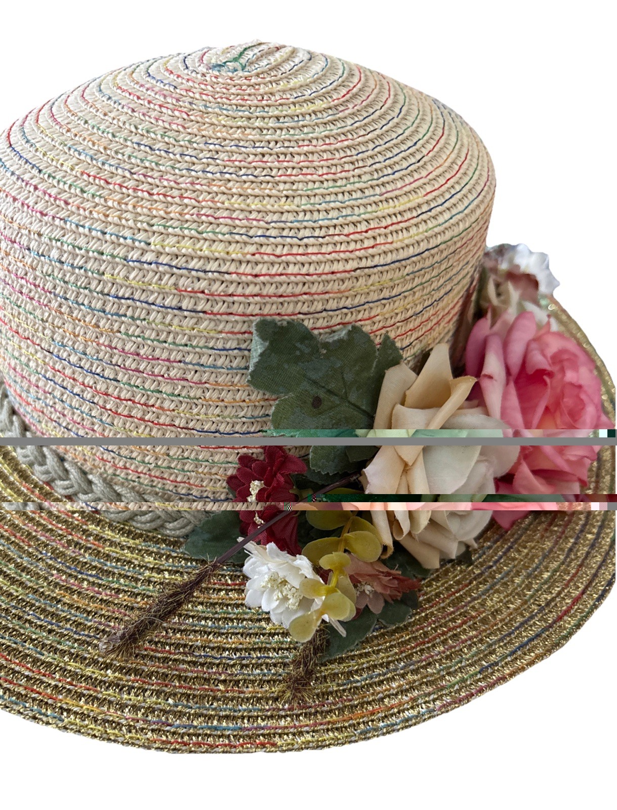 Straw Hat Women Cottagecore Sun Church Derby Linen Blend Decorative Flowers NICE