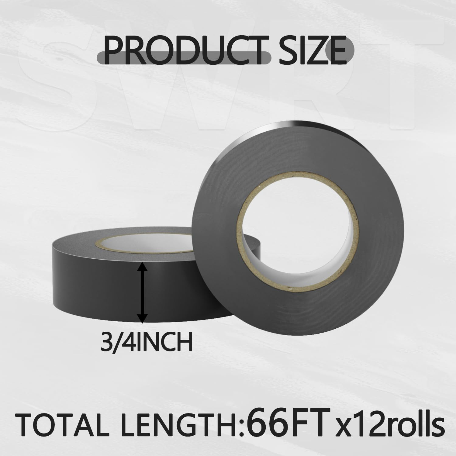 12 Pack Black Electrical Tape Waterproof 0.75 in X 66 FT High Temp Electric 600V