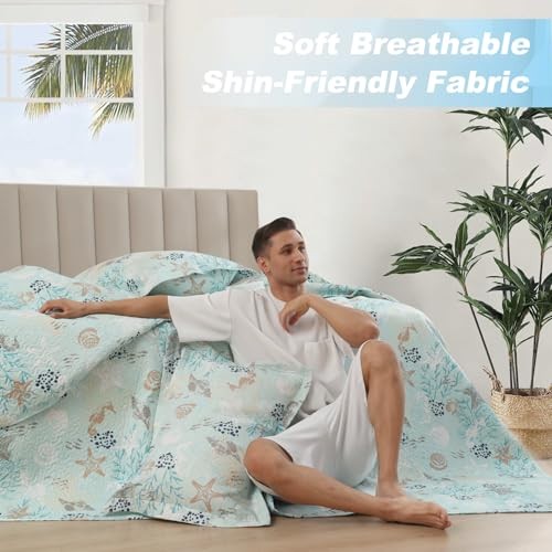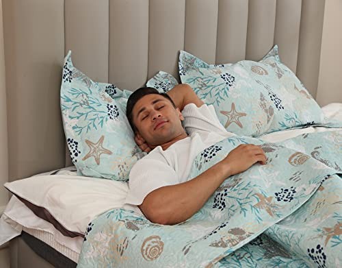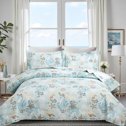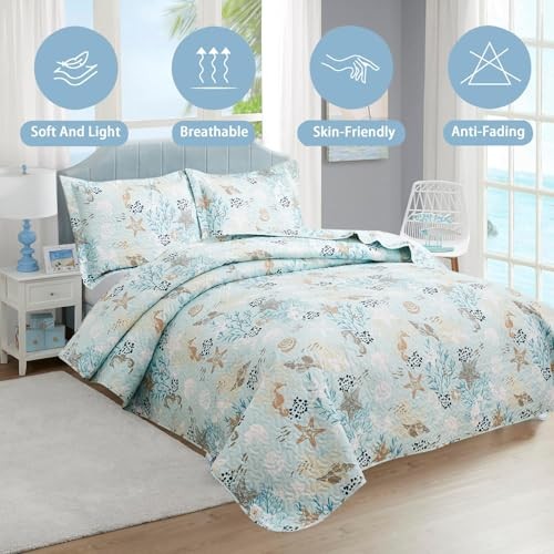3-Piece Coastal Beach Bedspread Set Quilt Set Blue Ocean Full/Queen Green Gray